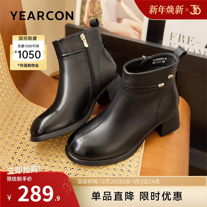意尔康女鞋2025冬季大码羊皮加绒保暖短靴粗跟妈妈皮鞋及踝靴真皮
