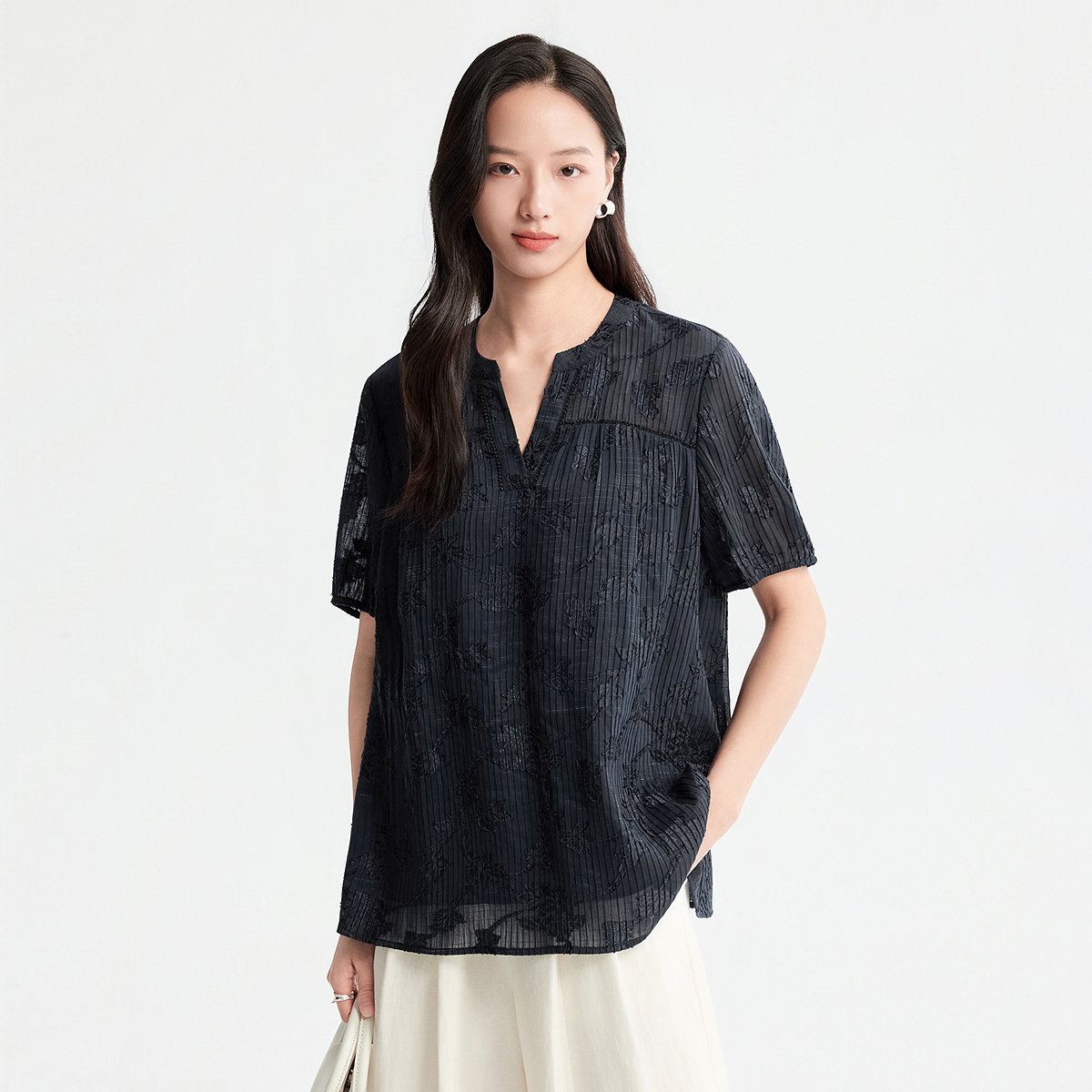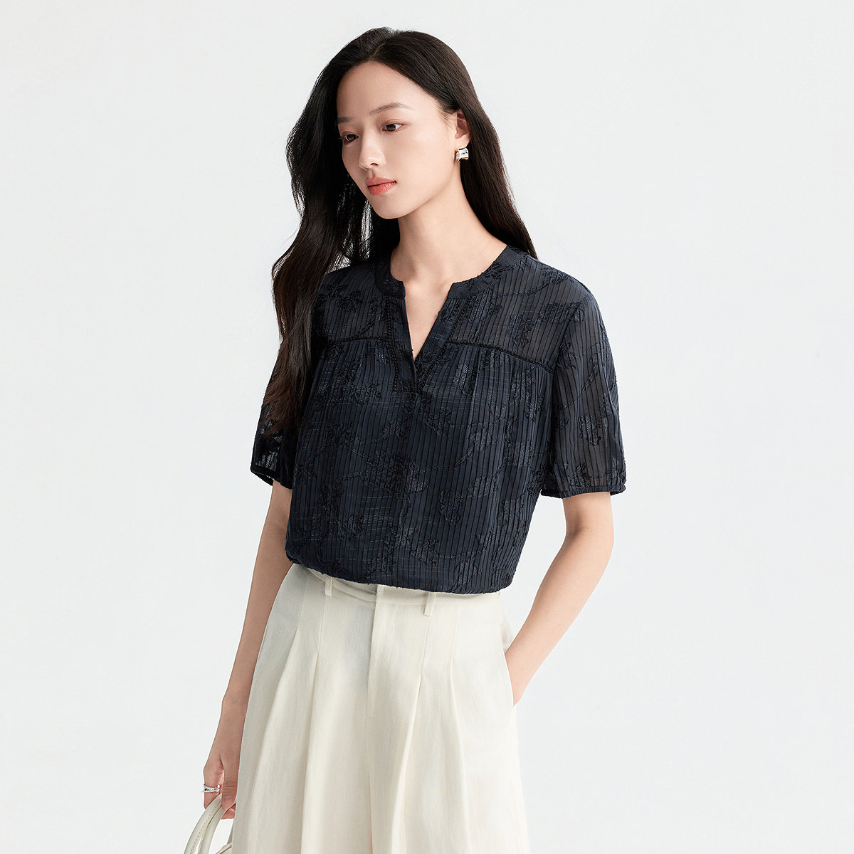 FINITY菲妮迪雪纺衫2026年夏季新款简约藏青色条纹设计感上衣女装