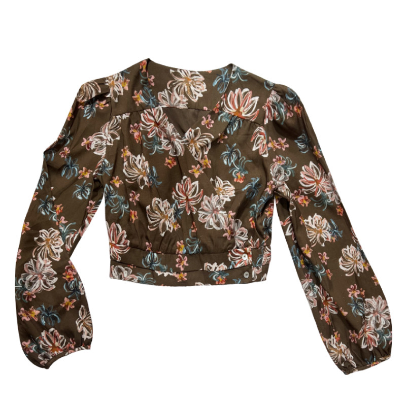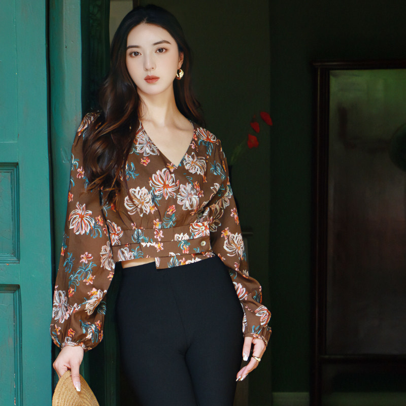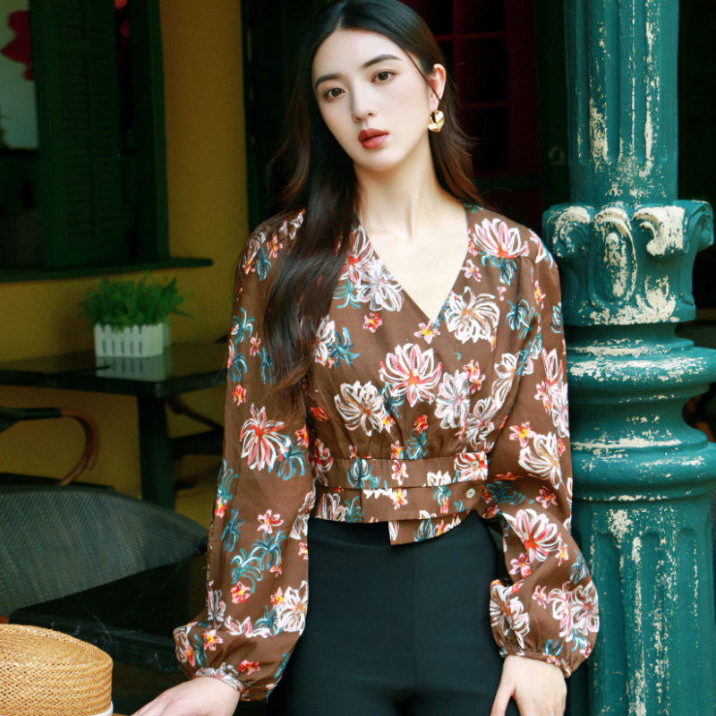 juju定制秋季长袖上衣V领碎花衬衫港风复古设计感短款衬衣气质女