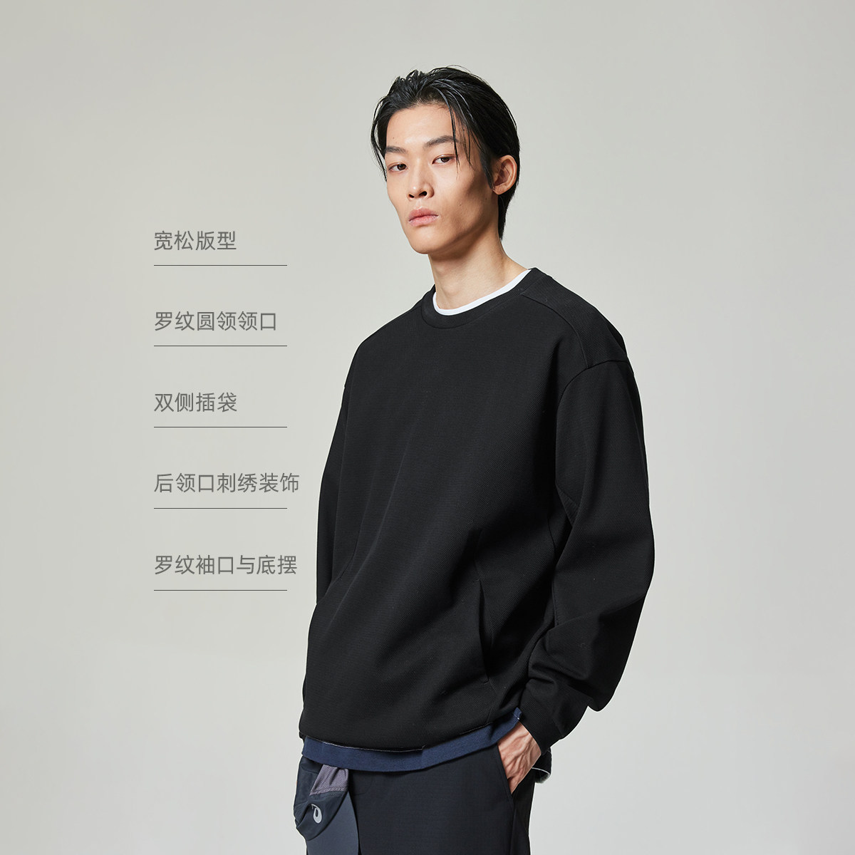 略宽松版型 罗纹圆领袖口与底摆 双侧插袋