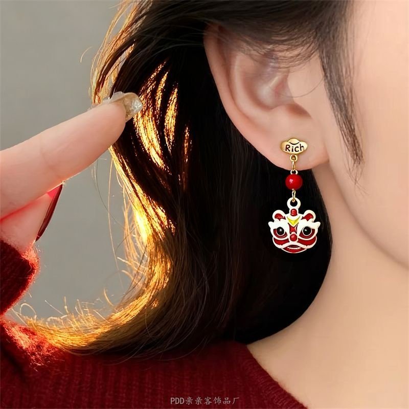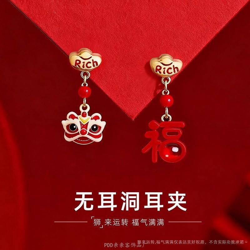 儿童耳夹无耳洞醒狮新年过年耳环钉坠红色秋冬小众免打孔气质耳饰