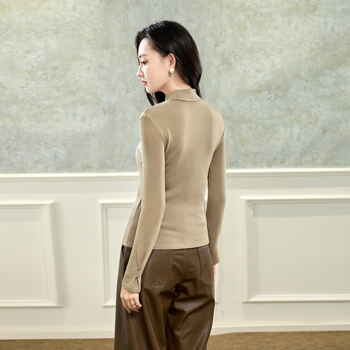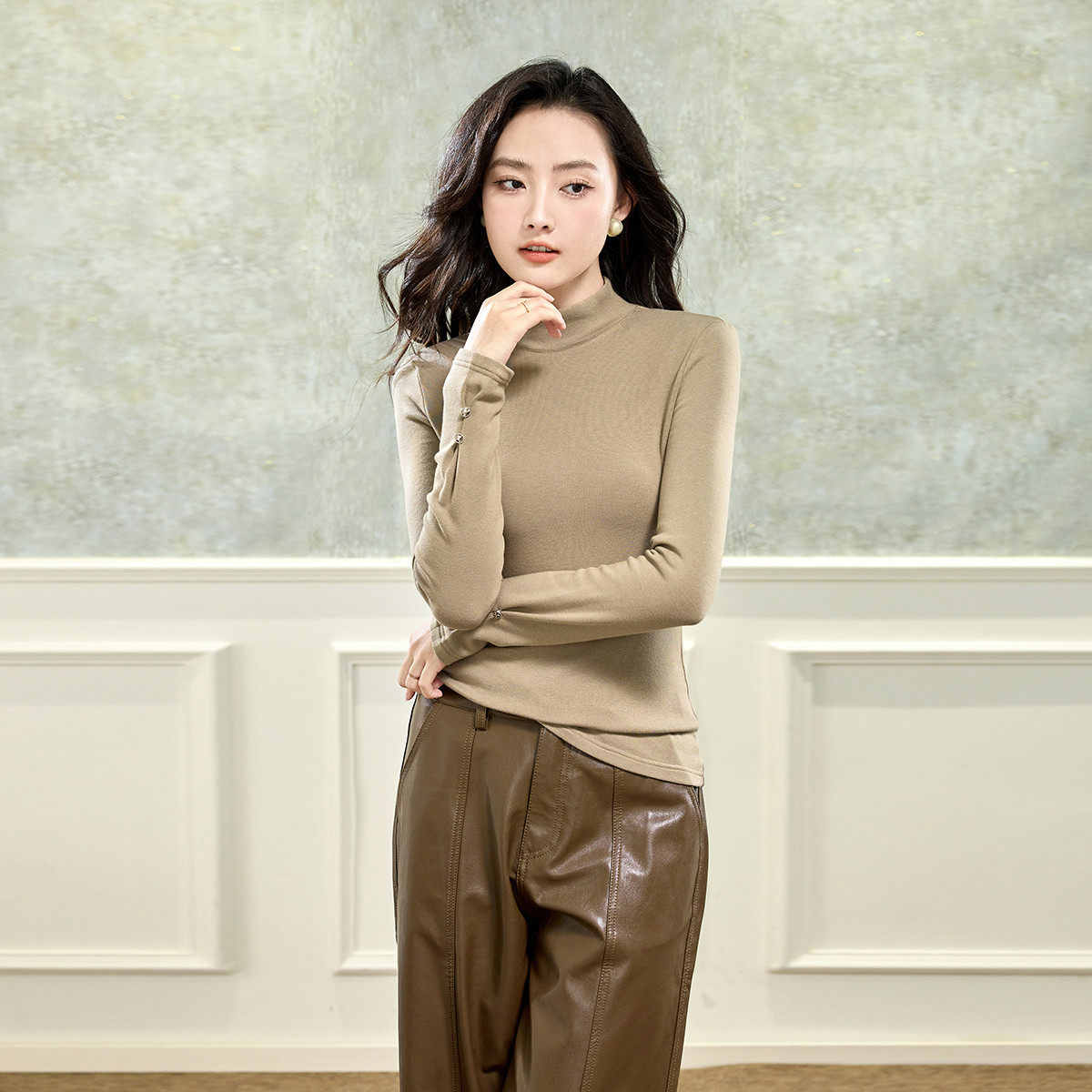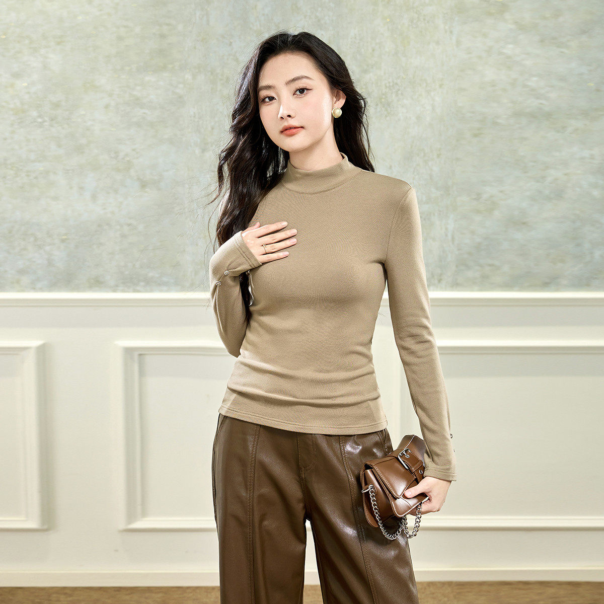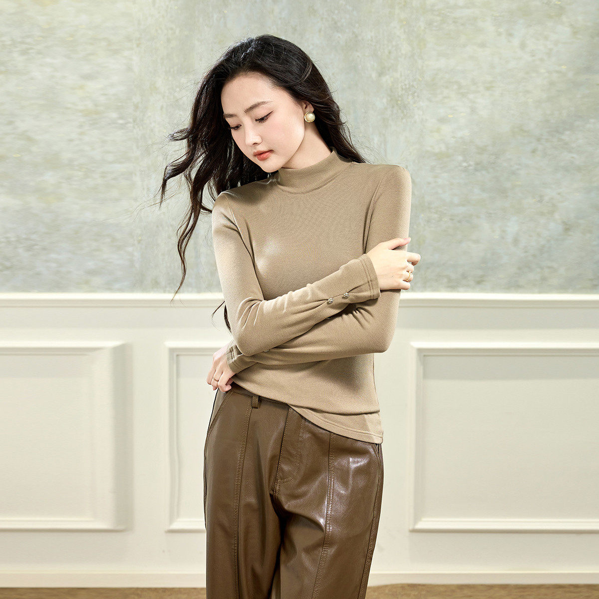 SMEN诗萌轻熟简约风半高领2026长袖T恤沙褐色针织衫高弹力打底衫