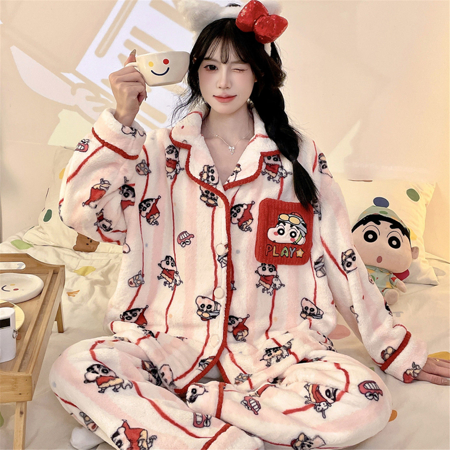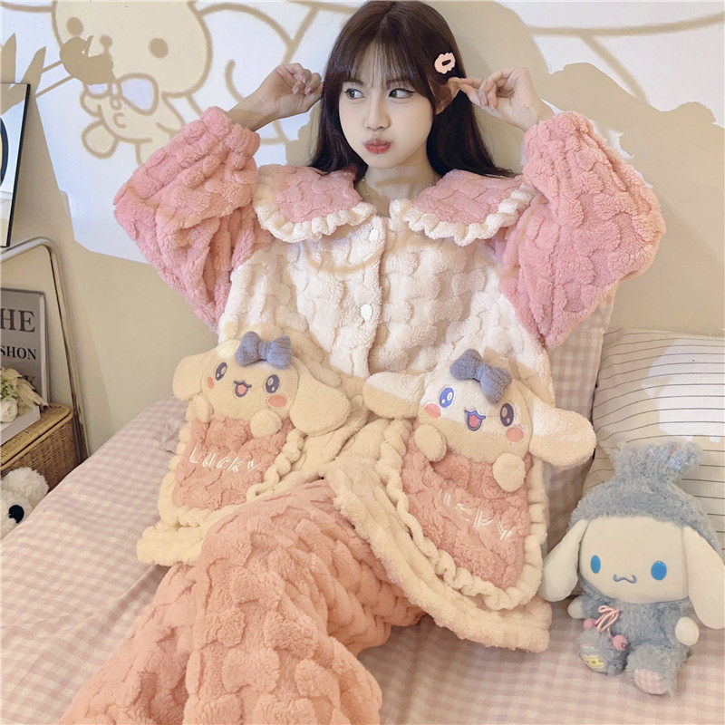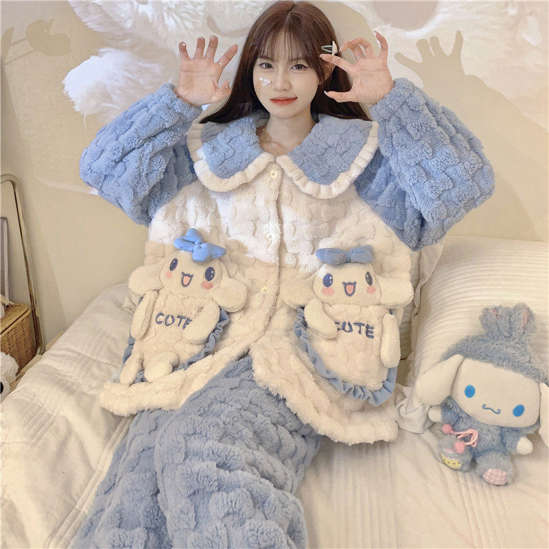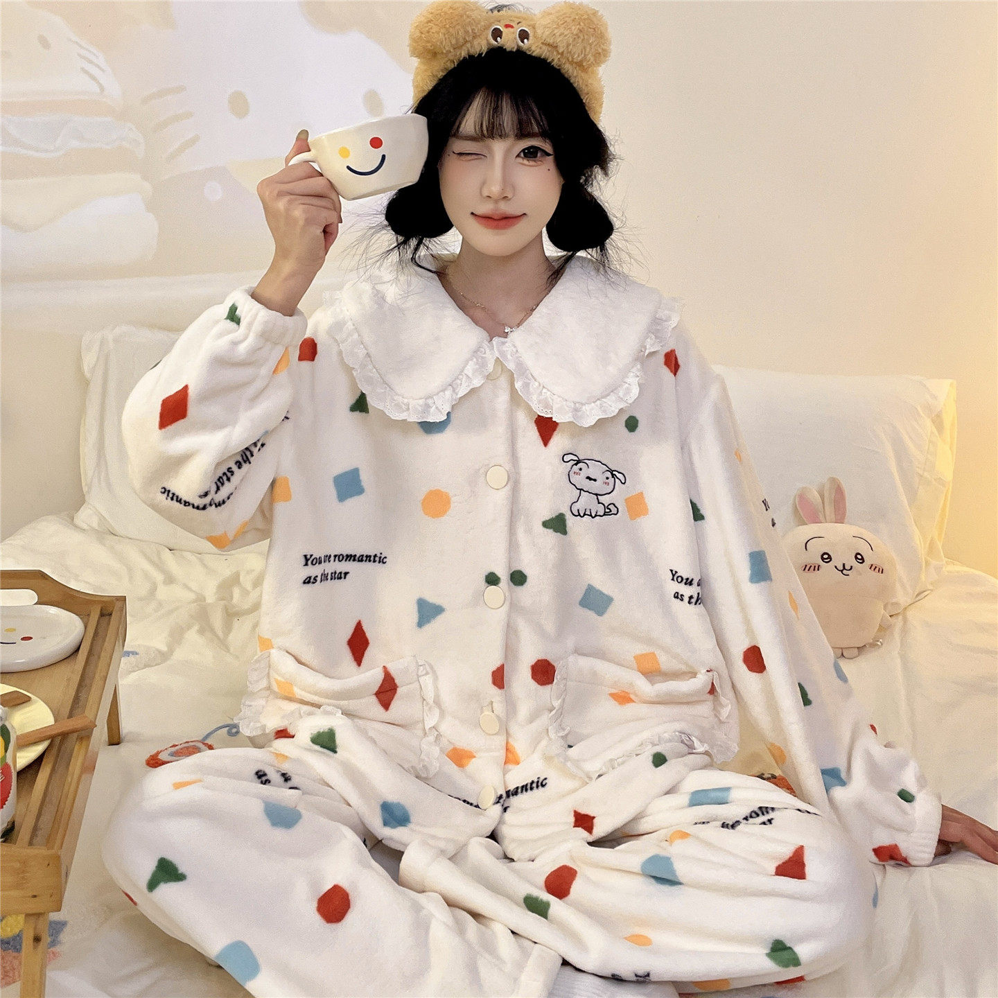 珊瑚绒睡衣女孩冬季加绒法兰绒青少年高中学生韩版可爱家居服套装