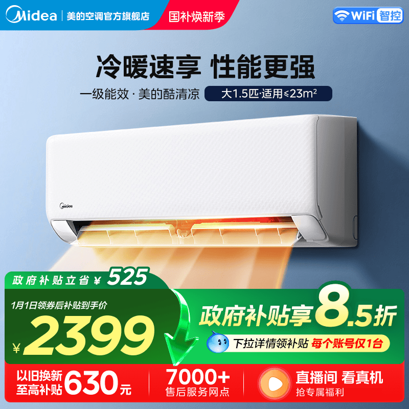 美的官方空调一级省电节能大1.5匹卧室变频冷暖挂机酷清凉