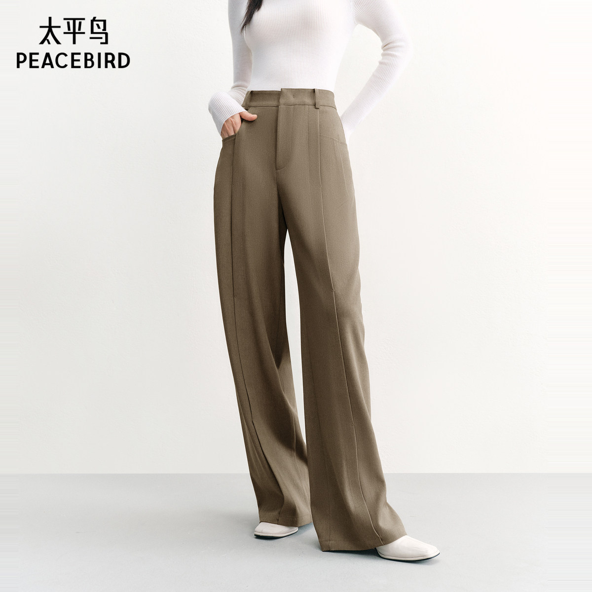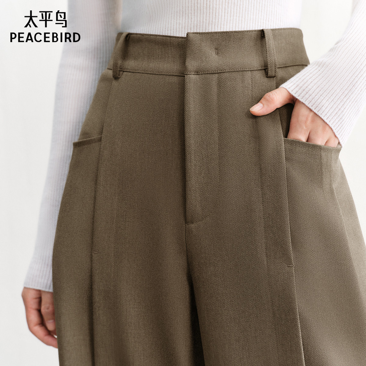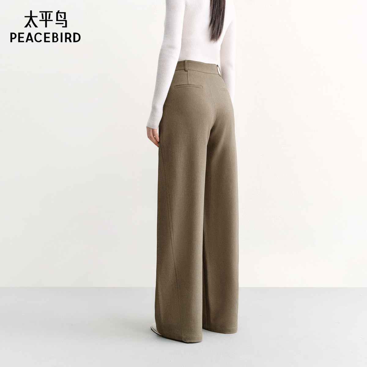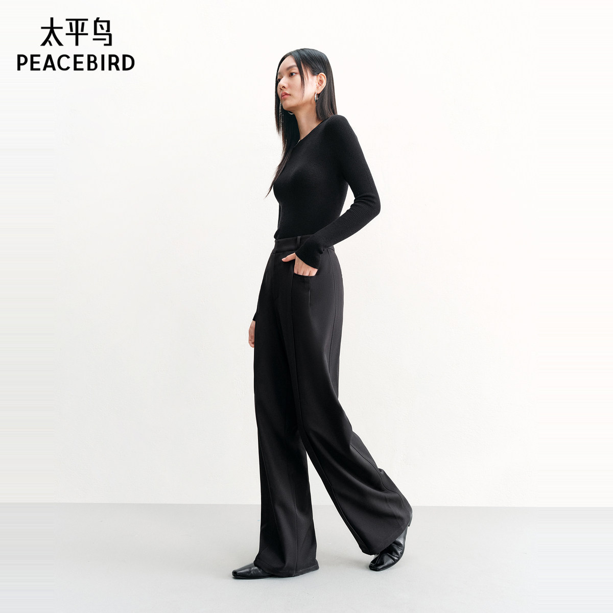 太平鸟时尚摩登压褶阔腿裤年秋冬款黑色加厚高腰直筒西装裤*