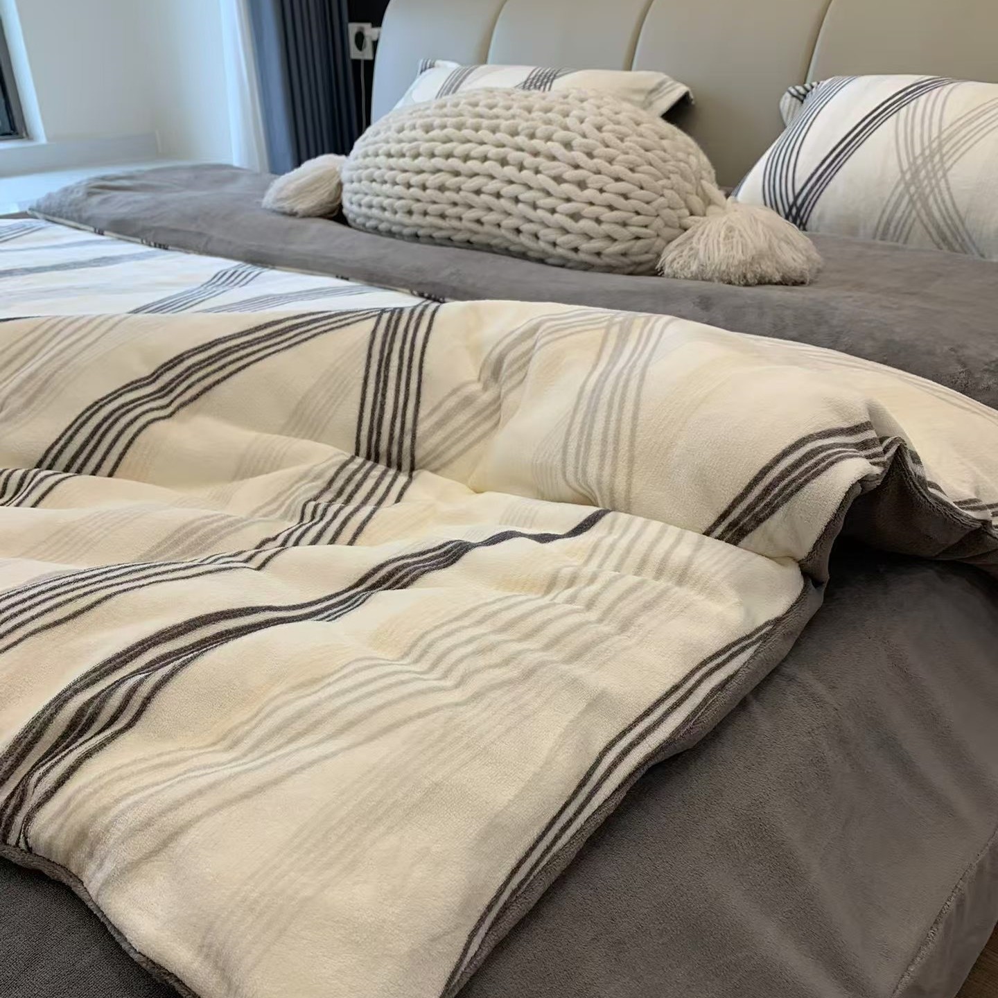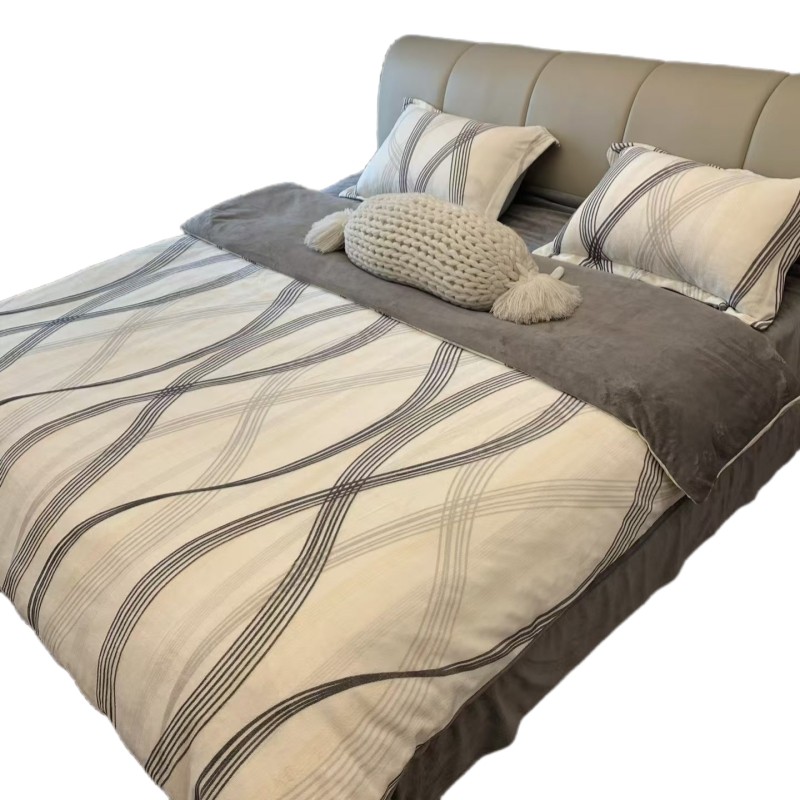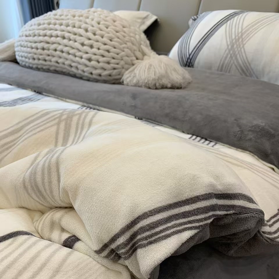 冬季新款牛奶绒床上四件套简约大气条纹珊瑚绒被套床单保暖法兰绒