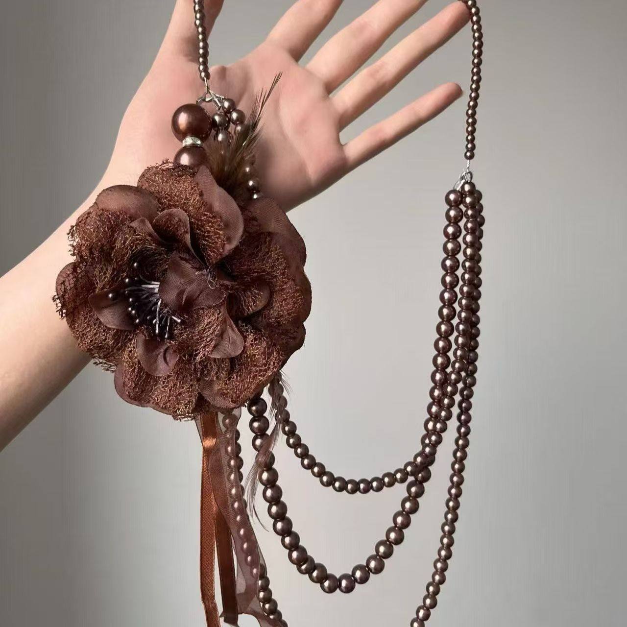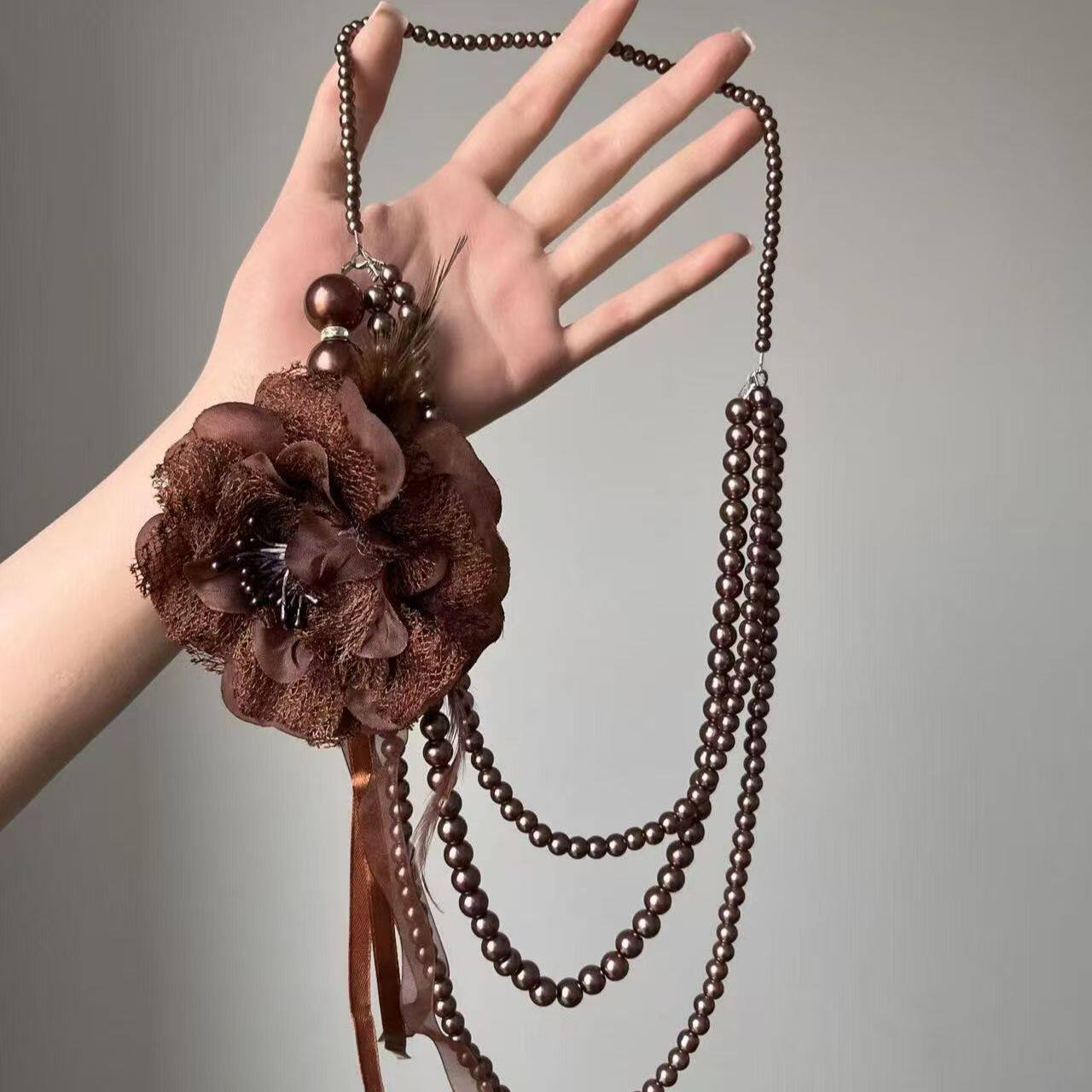 复古仿珍珠蕾丝花项链女生长款三层骨链氛围感毛衣链多层颈链花朵