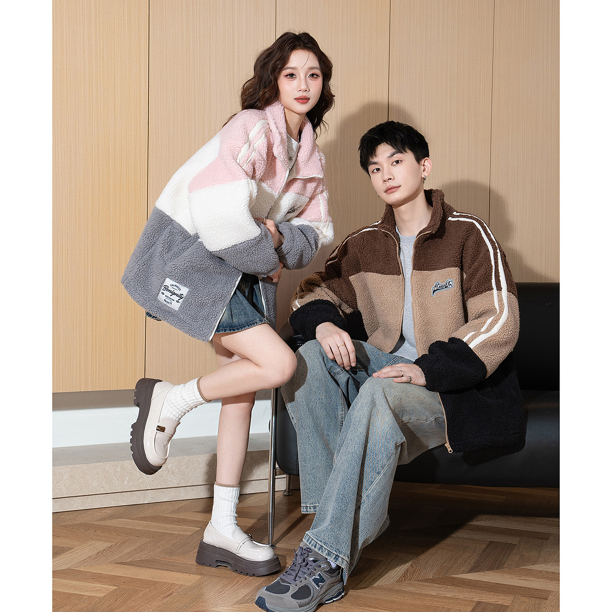 唐狮春季新款情侣外套女立领拼接短款流行仿羔毛厚上衣休闲TD