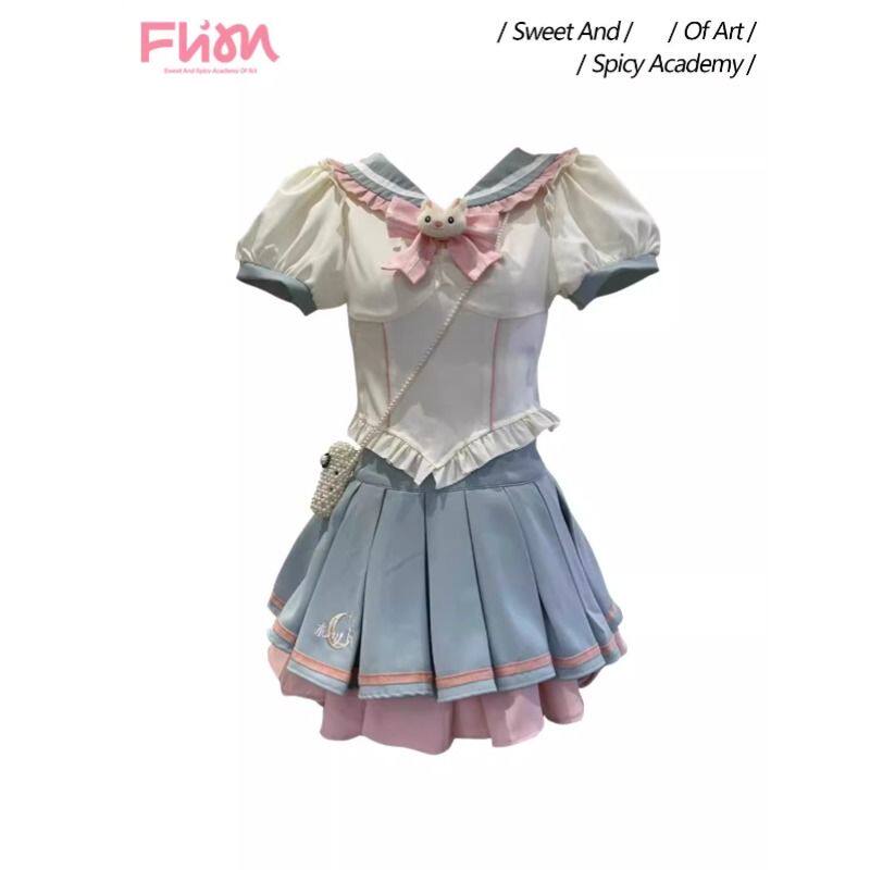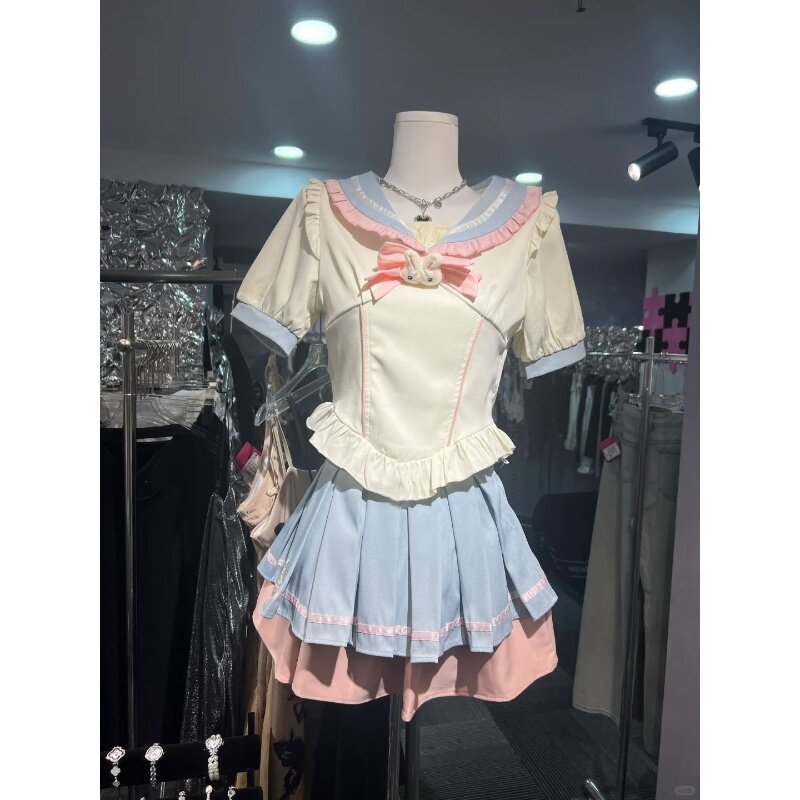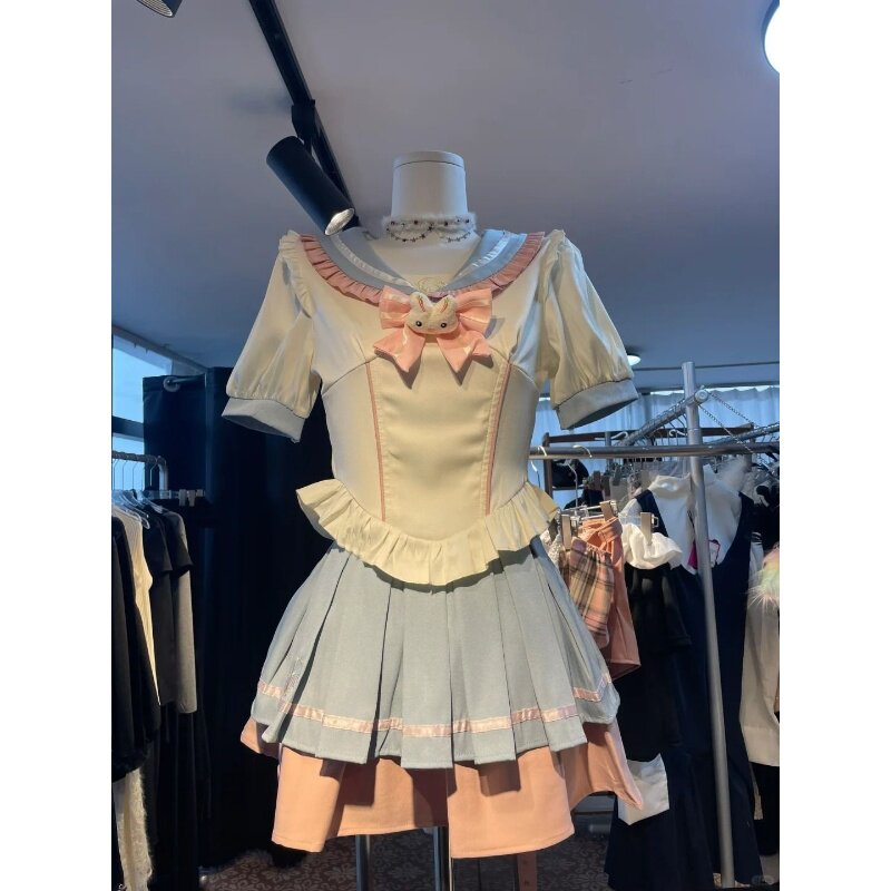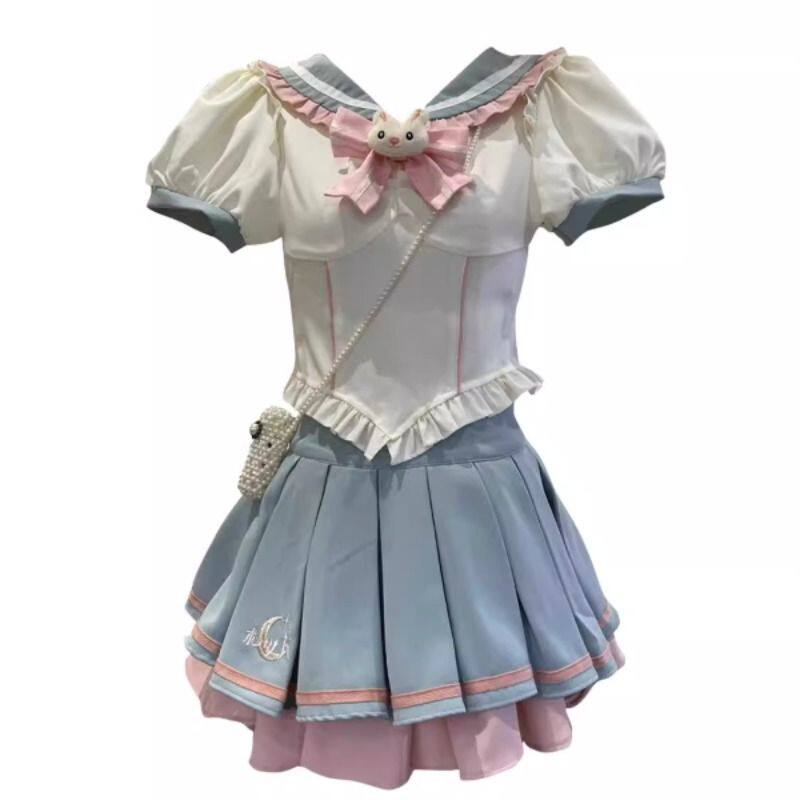 jk制服大码设计感洋气蝴蝶结短袖衬衣撞色蛋糕蓬蓬裙两件套衬衫