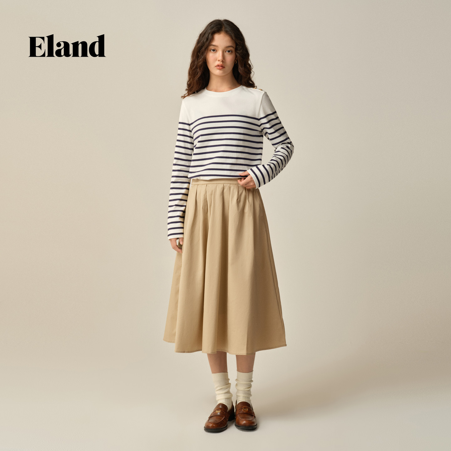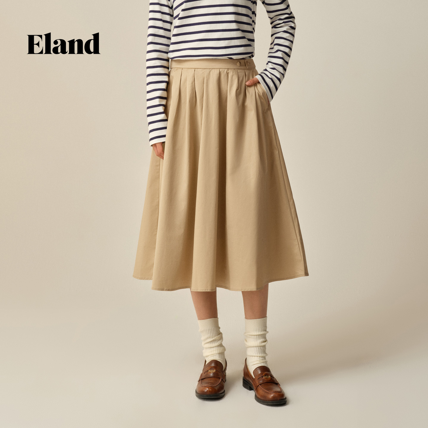 【97%棉】Eland衣恋半身裙女收腰显瘦纯色百褶裙2025冬季