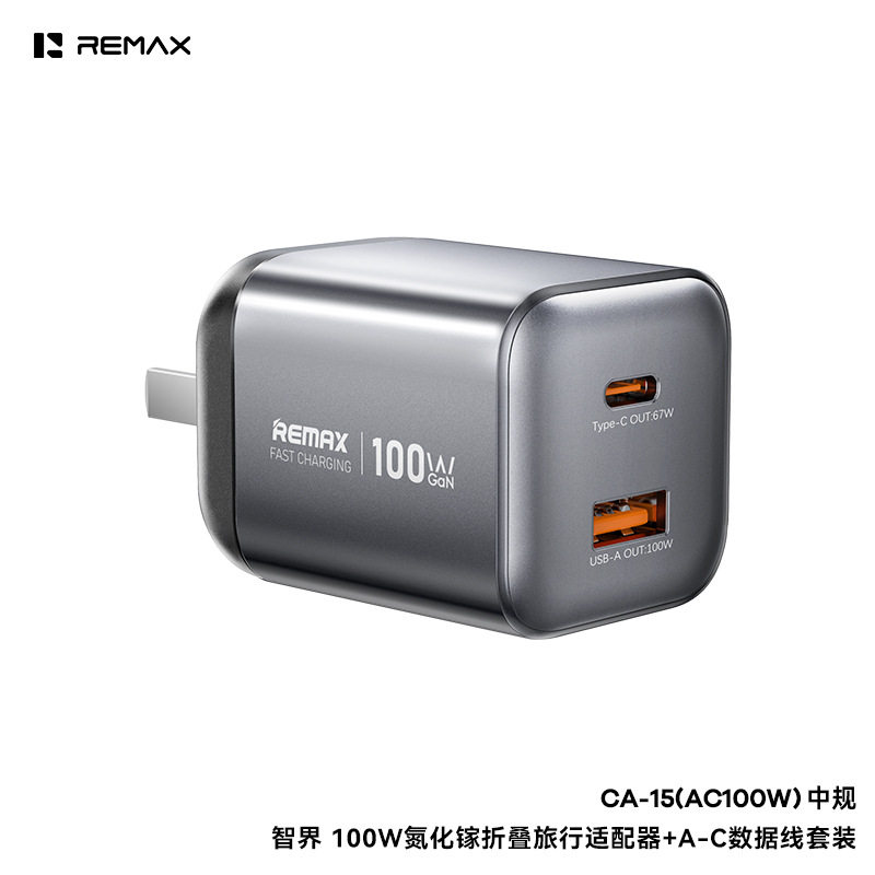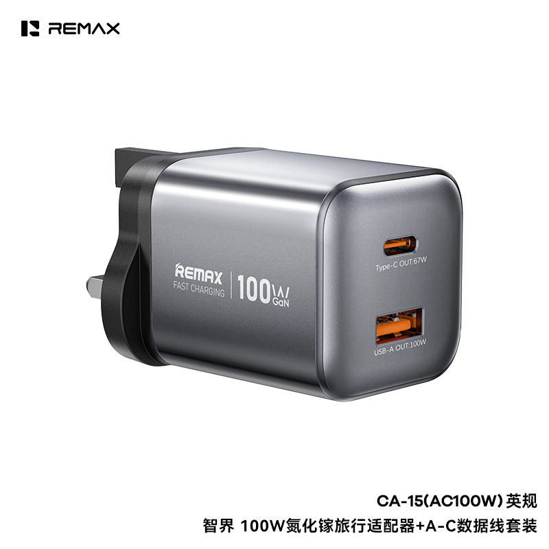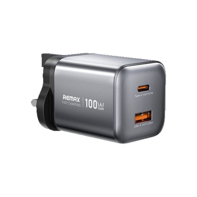 REMAX英制100W氮化镓充电器USB-A兼容安卓快充Type-C端口67W支援PD3.0适用苹果17三星26手机火牛港澳三脚插头