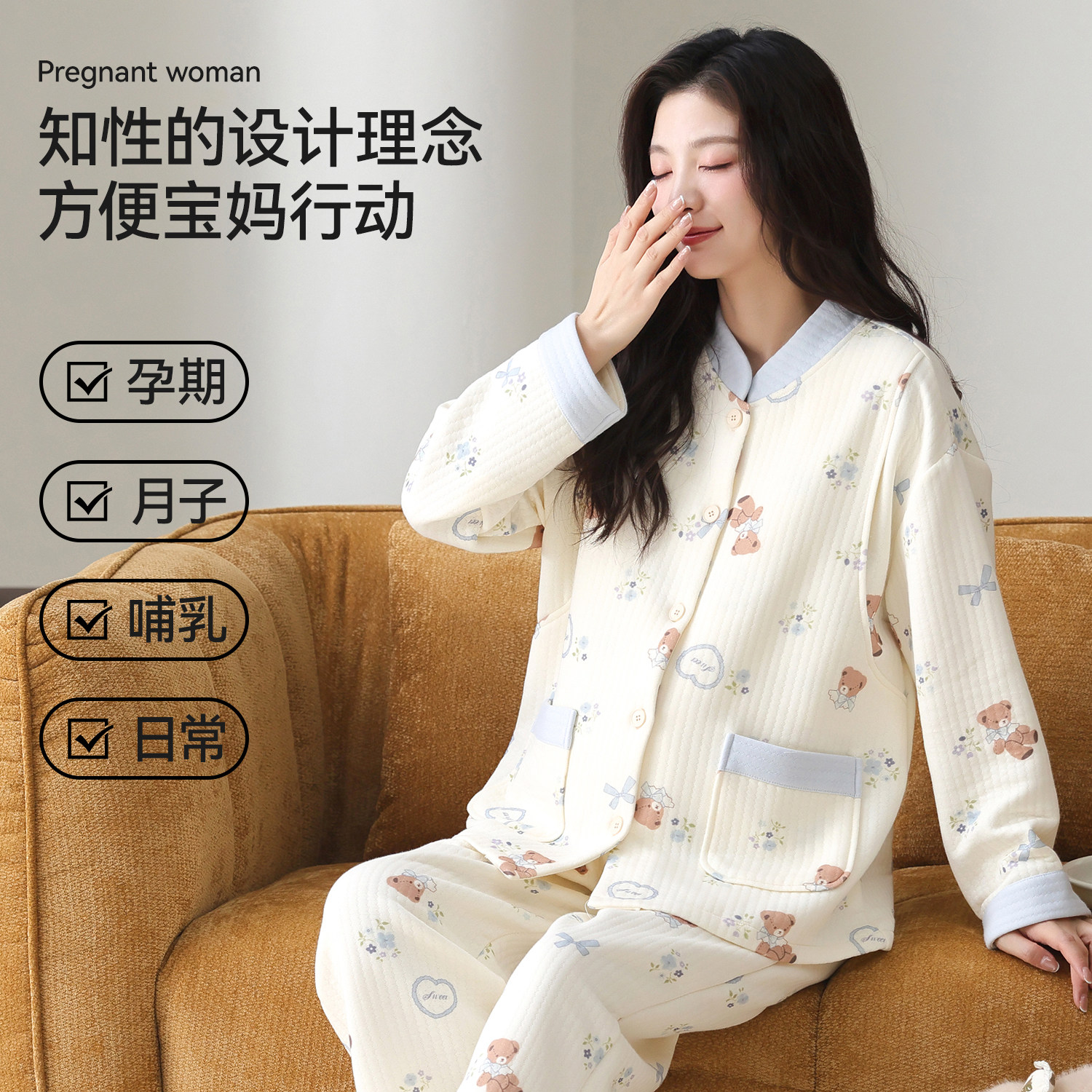 都市丽人纯棉睡衣月子服秋冬季保暖空气棉夹层产后孕妇哺乳家居服