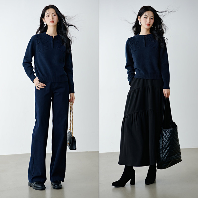 三福长袖上衣2025新款秋季圆领修身针织衫简约纯色内搭打底衫女装