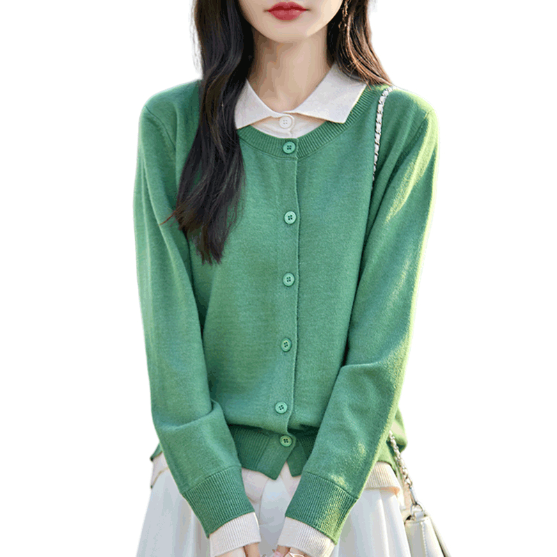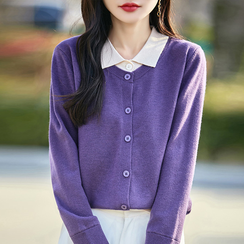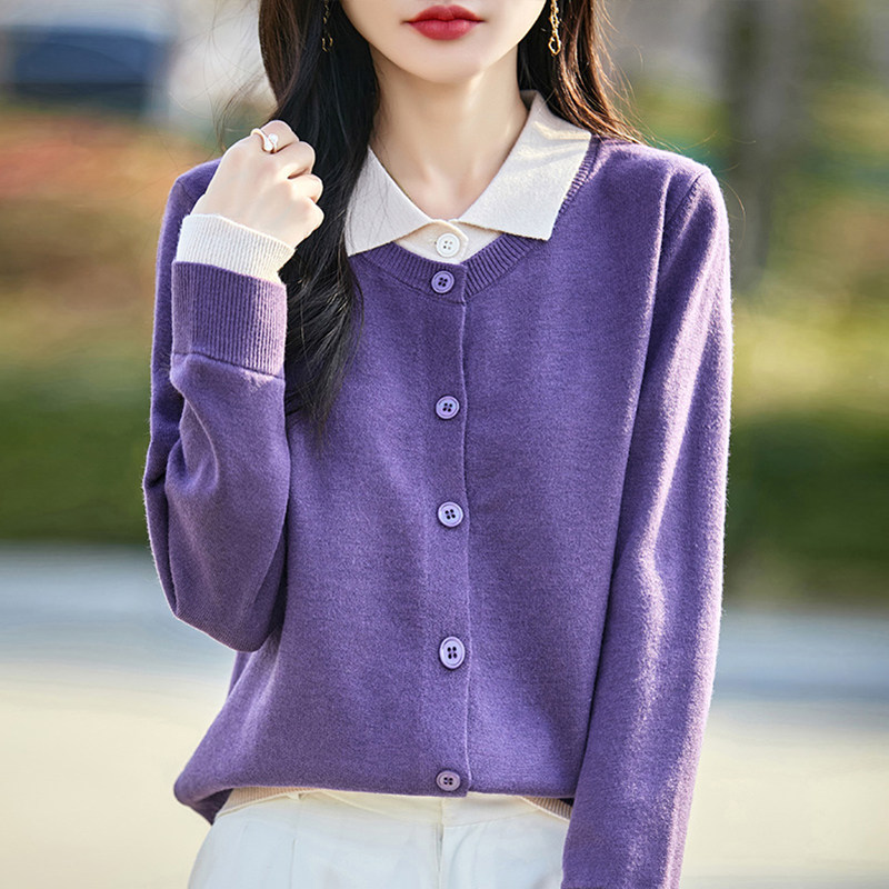 撤柜撤标(A)假两件娃娃领撞色针织开衫外套女春秋款大码女装毛衣