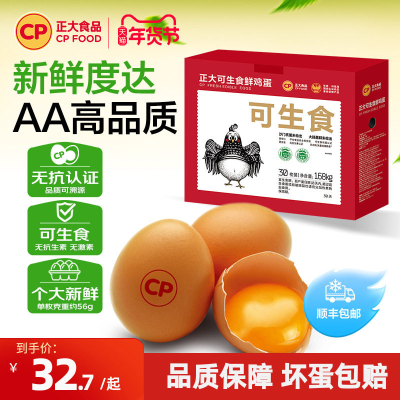 正大可生食新鲜鸡蛋30枚生吃无沙门氏菌鸡蛋批发整箱1.68kg包邮