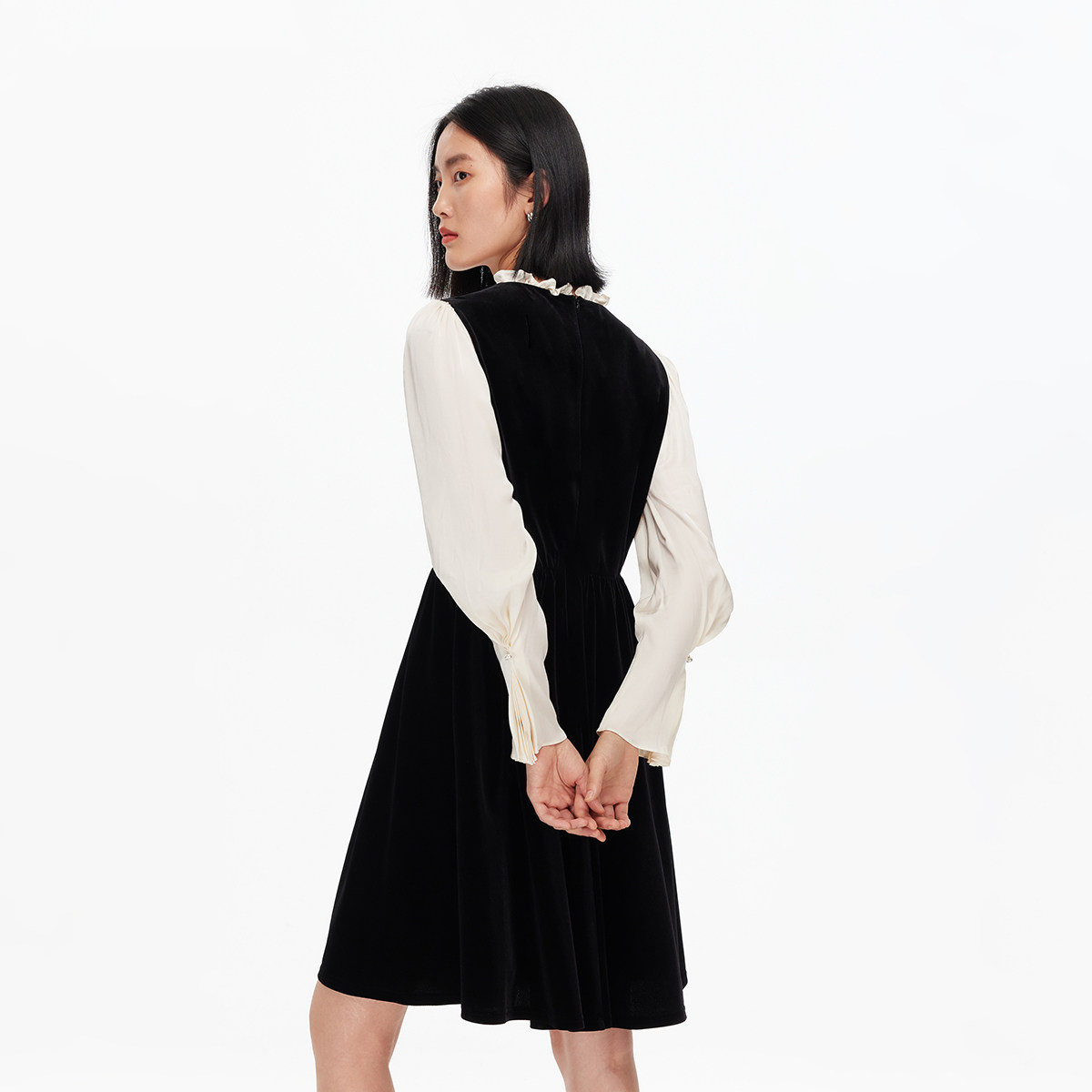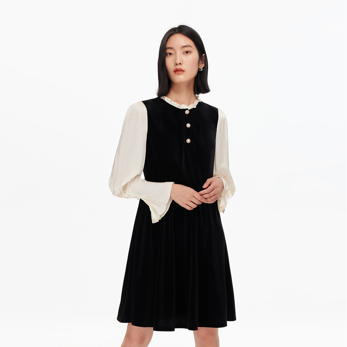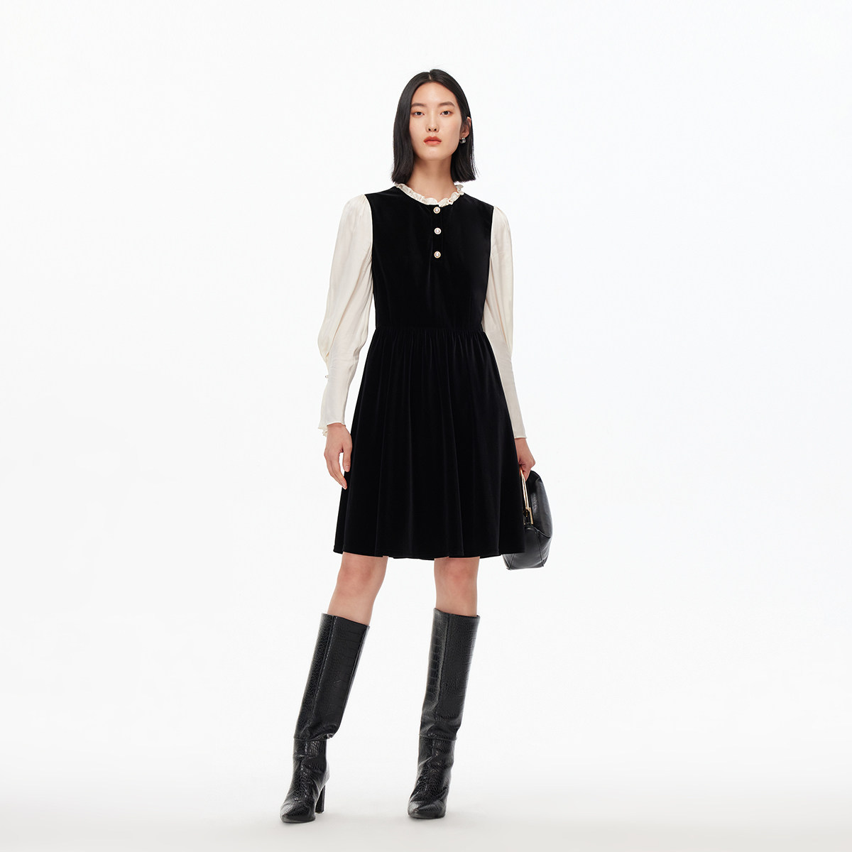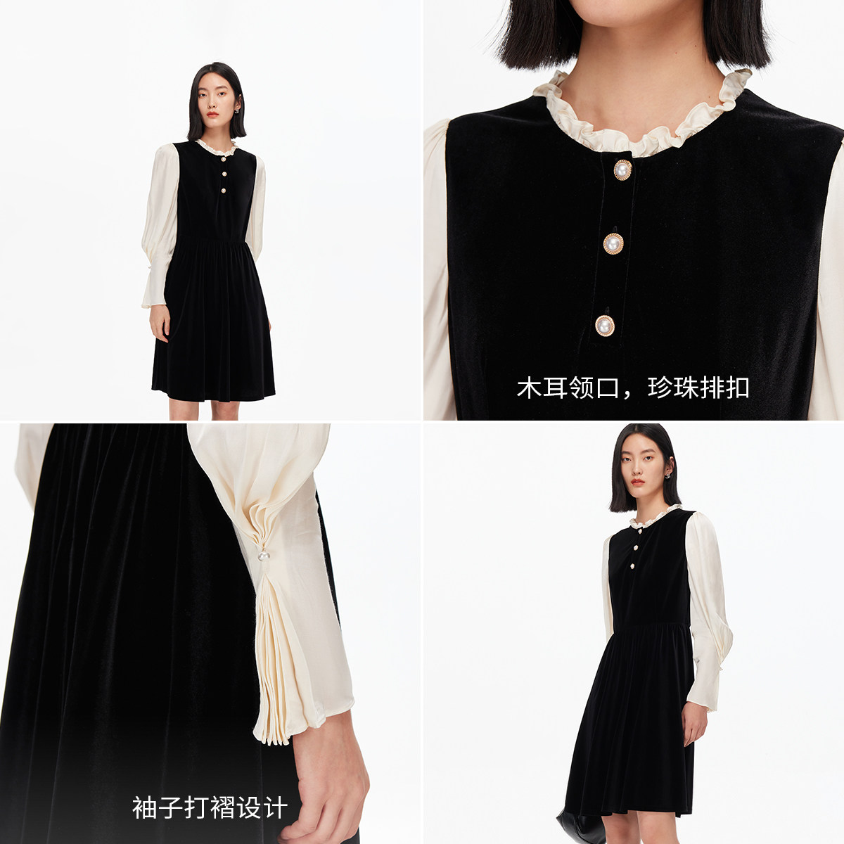Vero Moda连衣裙2025秋季新款木耳领珍珠排扣A字丝绒裙32537D021