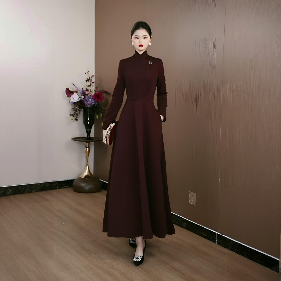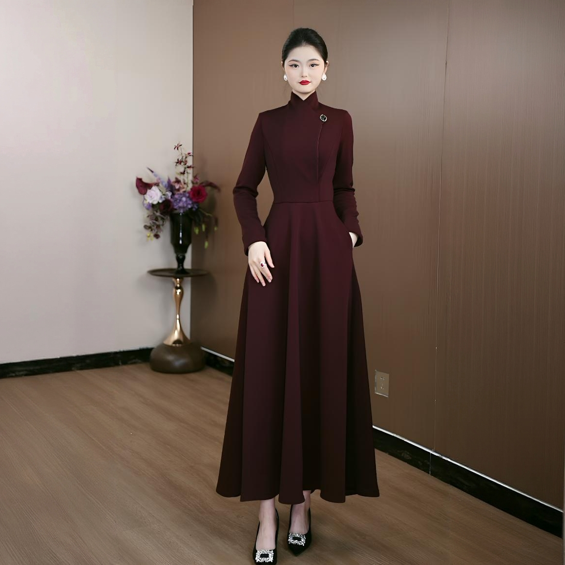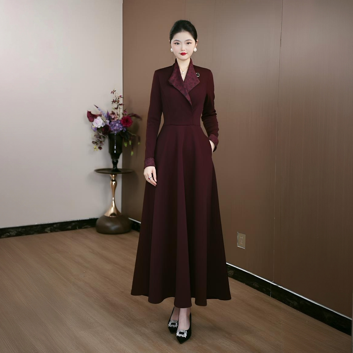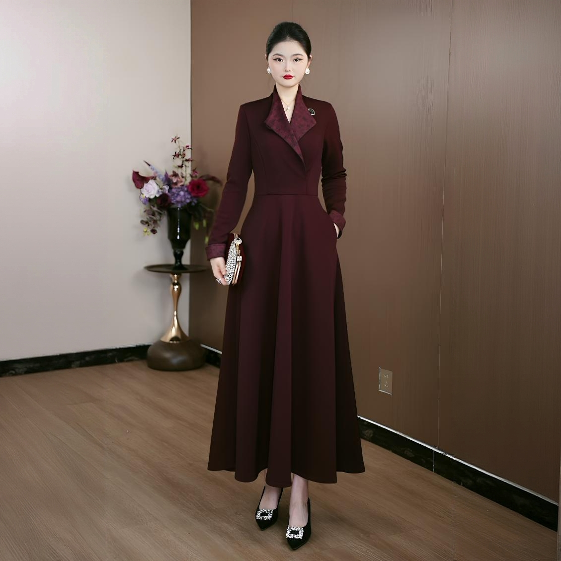 秋冬加绒加厚长款连衣裙收腰大摆过膝超长保暖优雅气质喜妈妈长裙