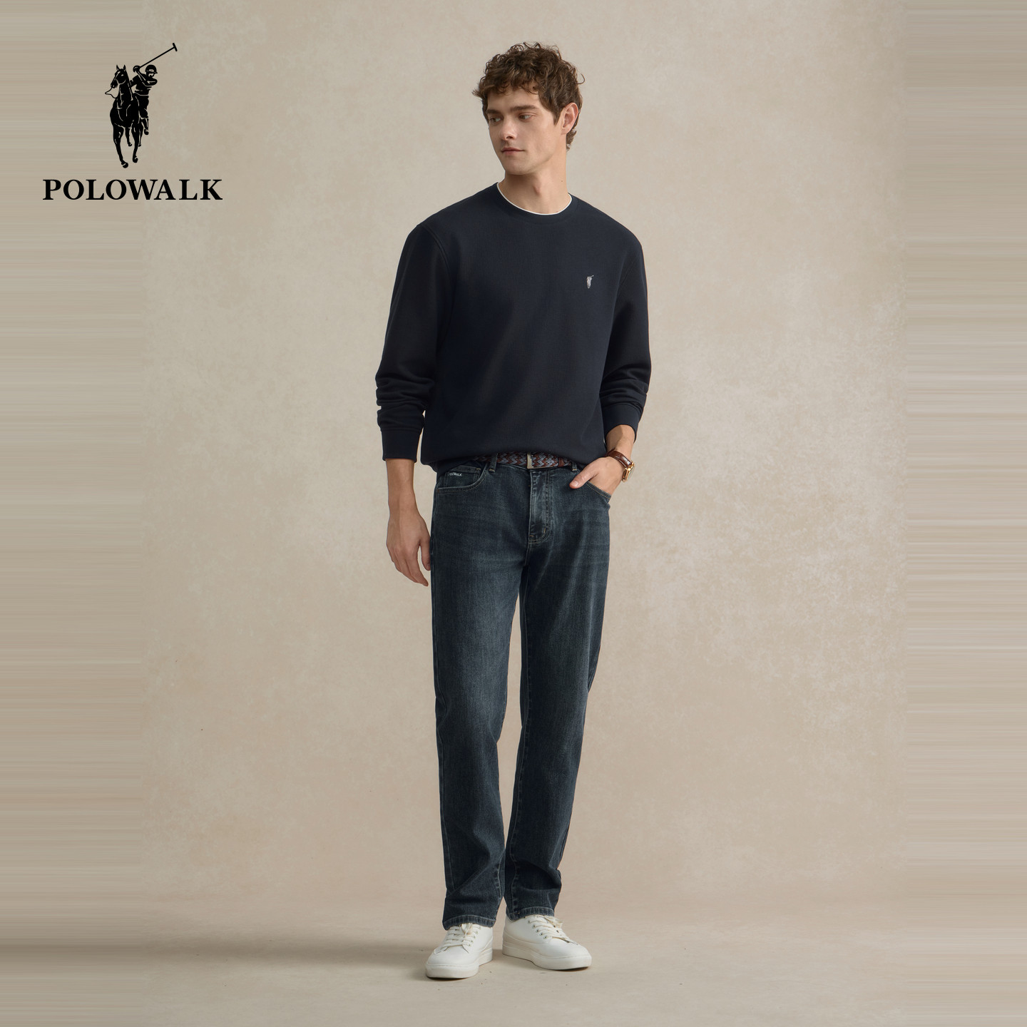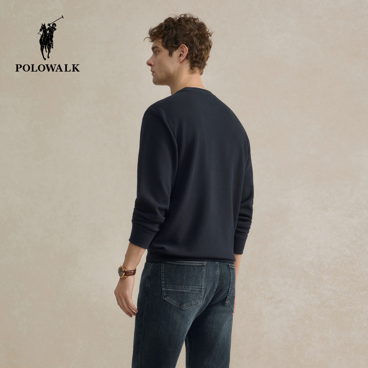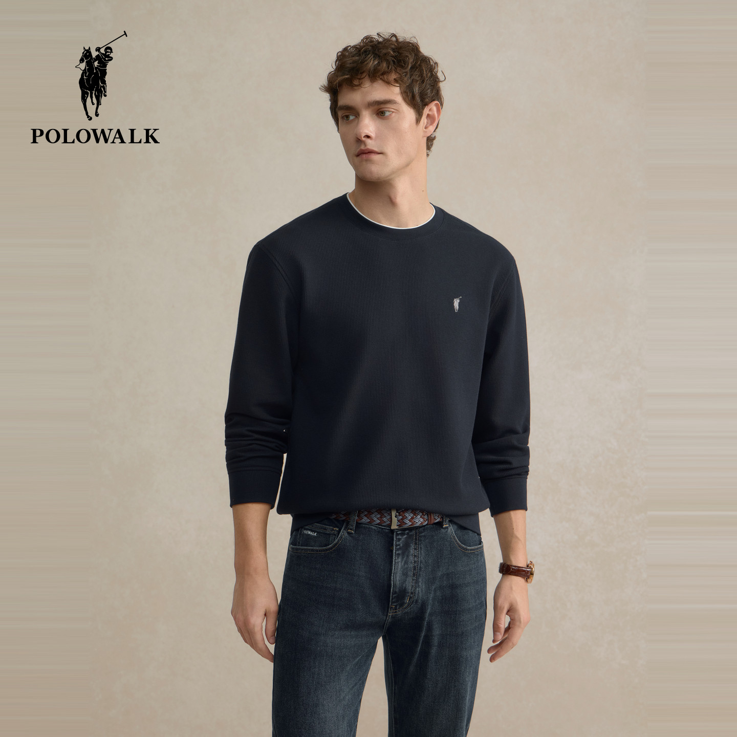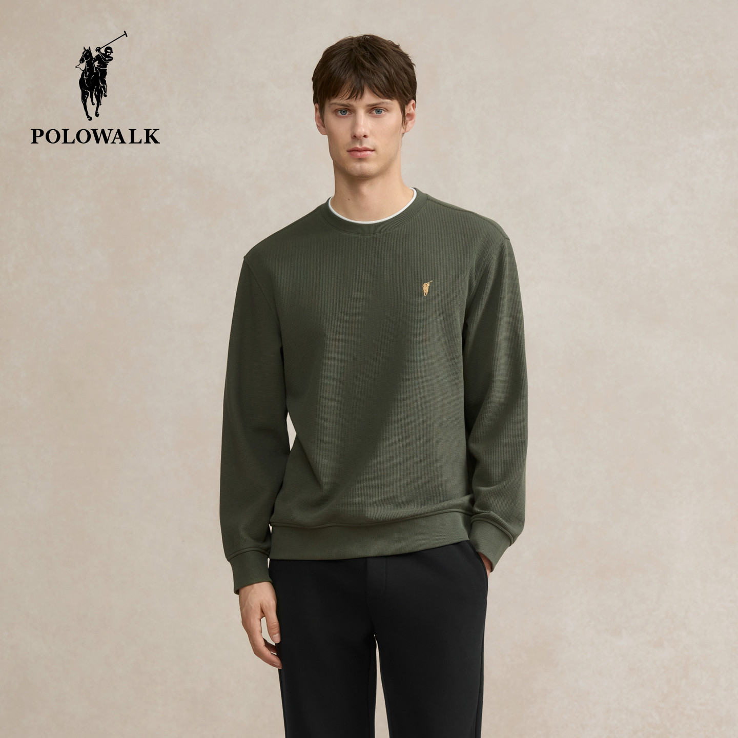 POLOWALK男装圆领卫衣2025秋季新品华夫格长袖纯色内搭休闲上衣