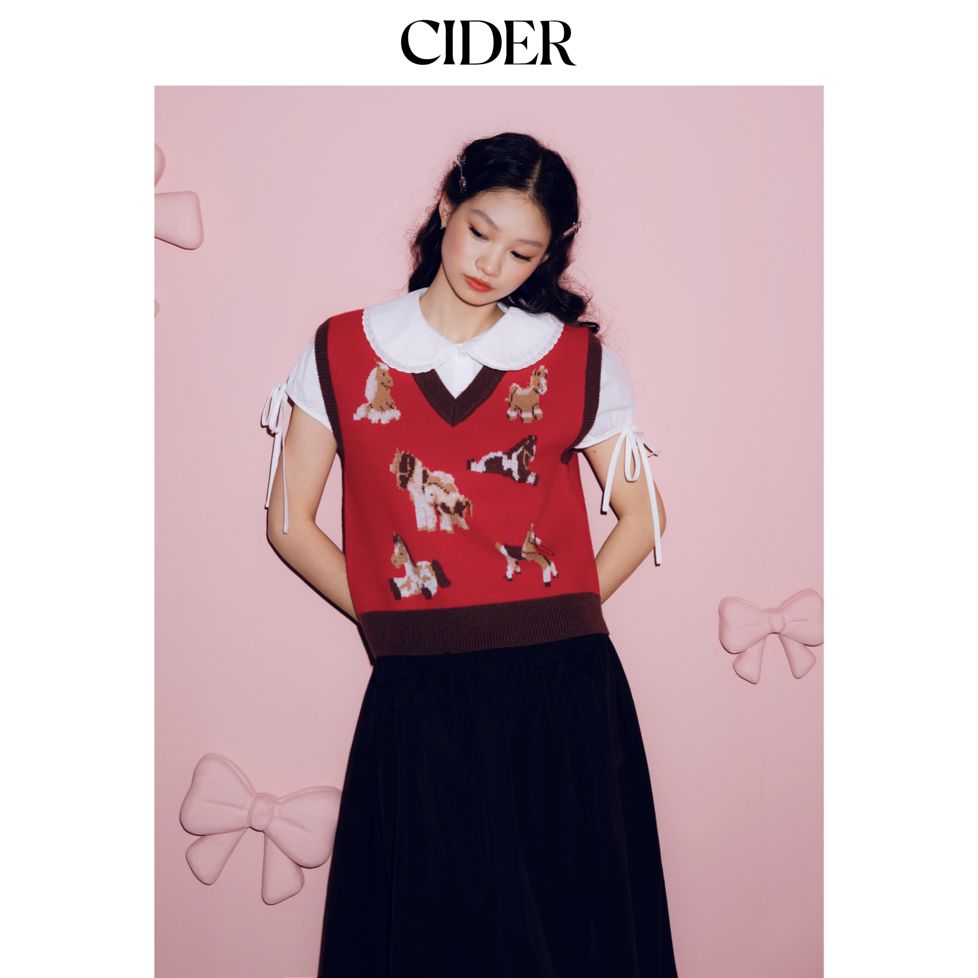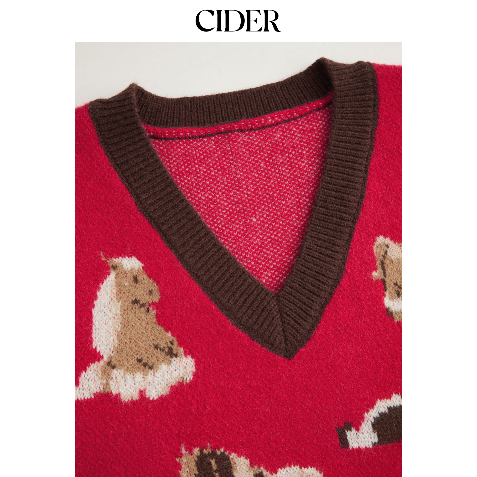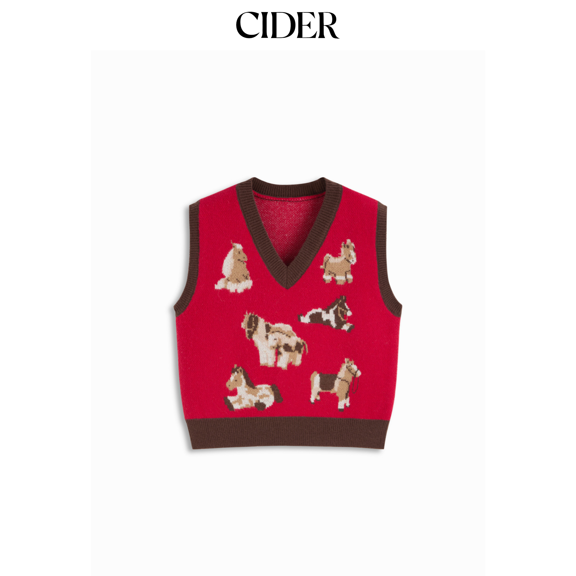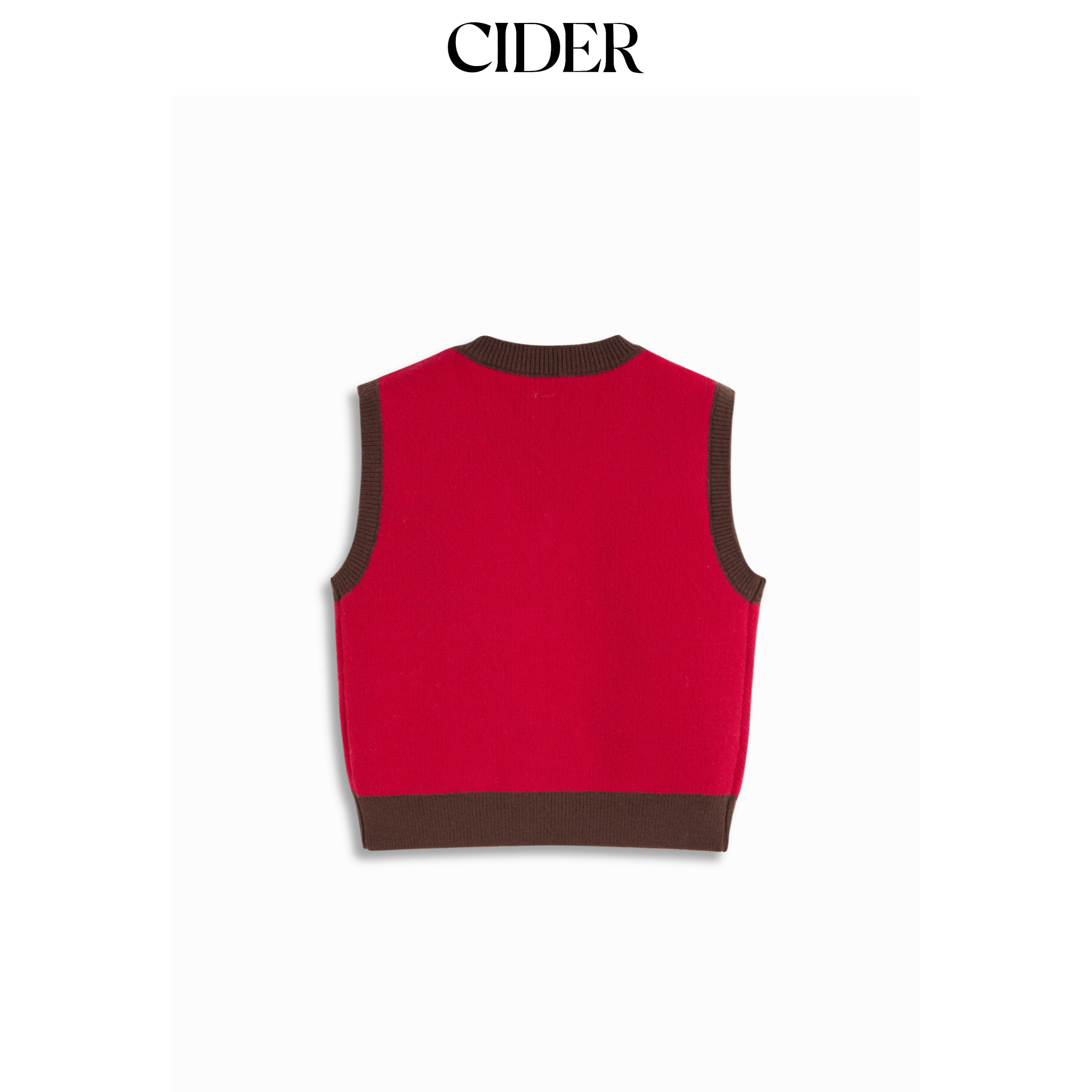 CIDER新年穿搭针织马印花V领撞色镶边短款背心红色毛衣115154284