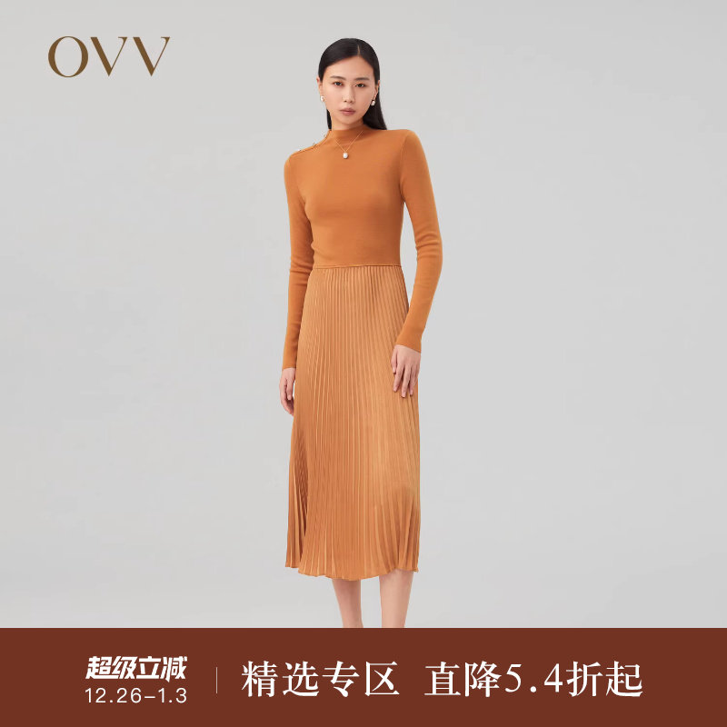 OVVOutlet秋冬新款女装针织半高领拼接梭织百褶休闲长袖连衣裙