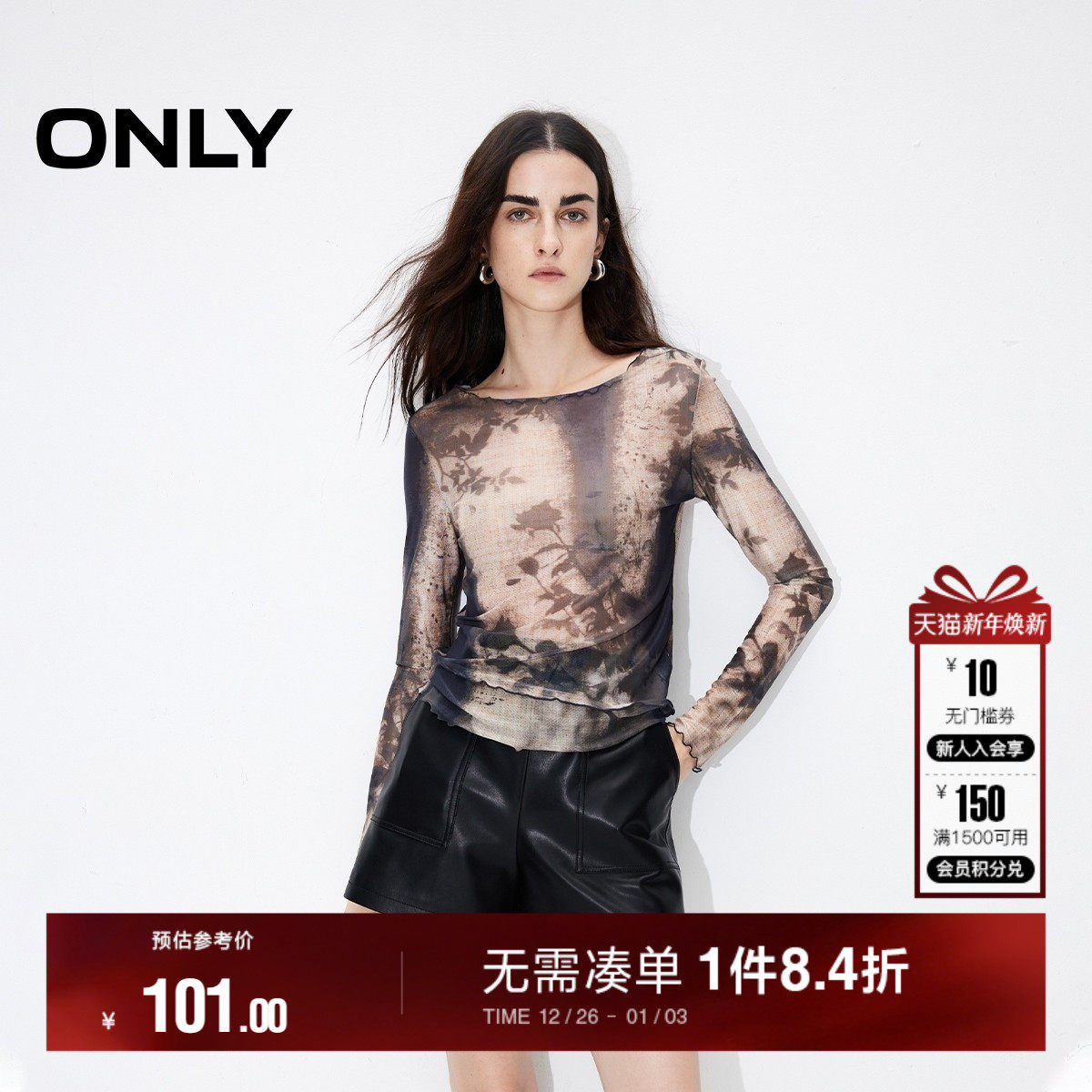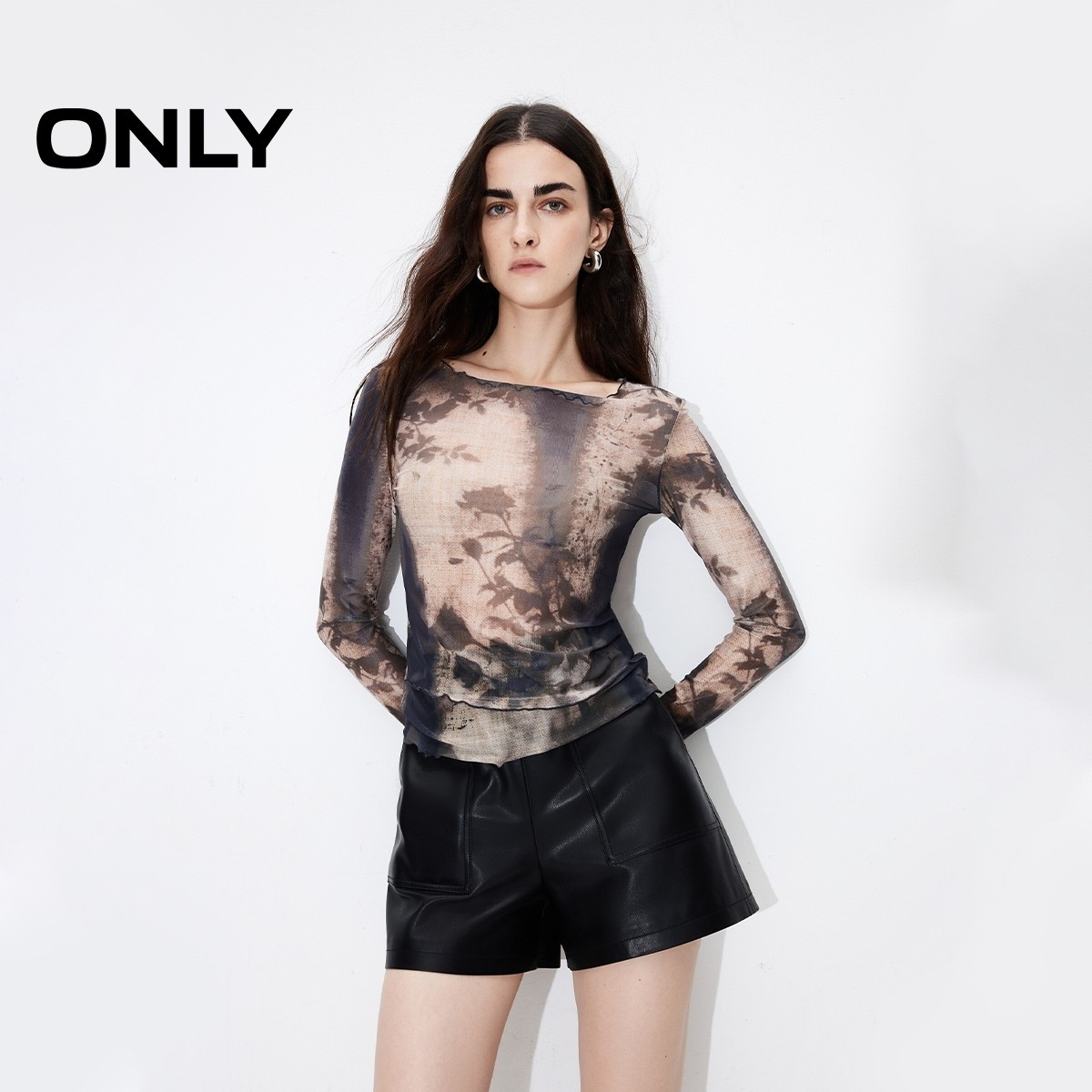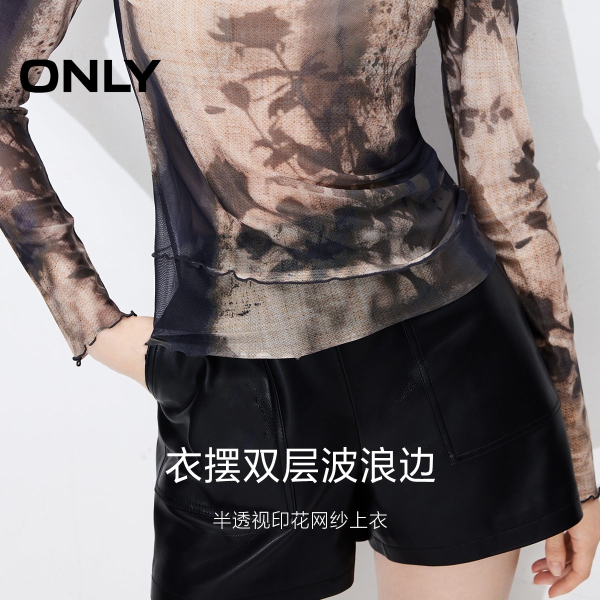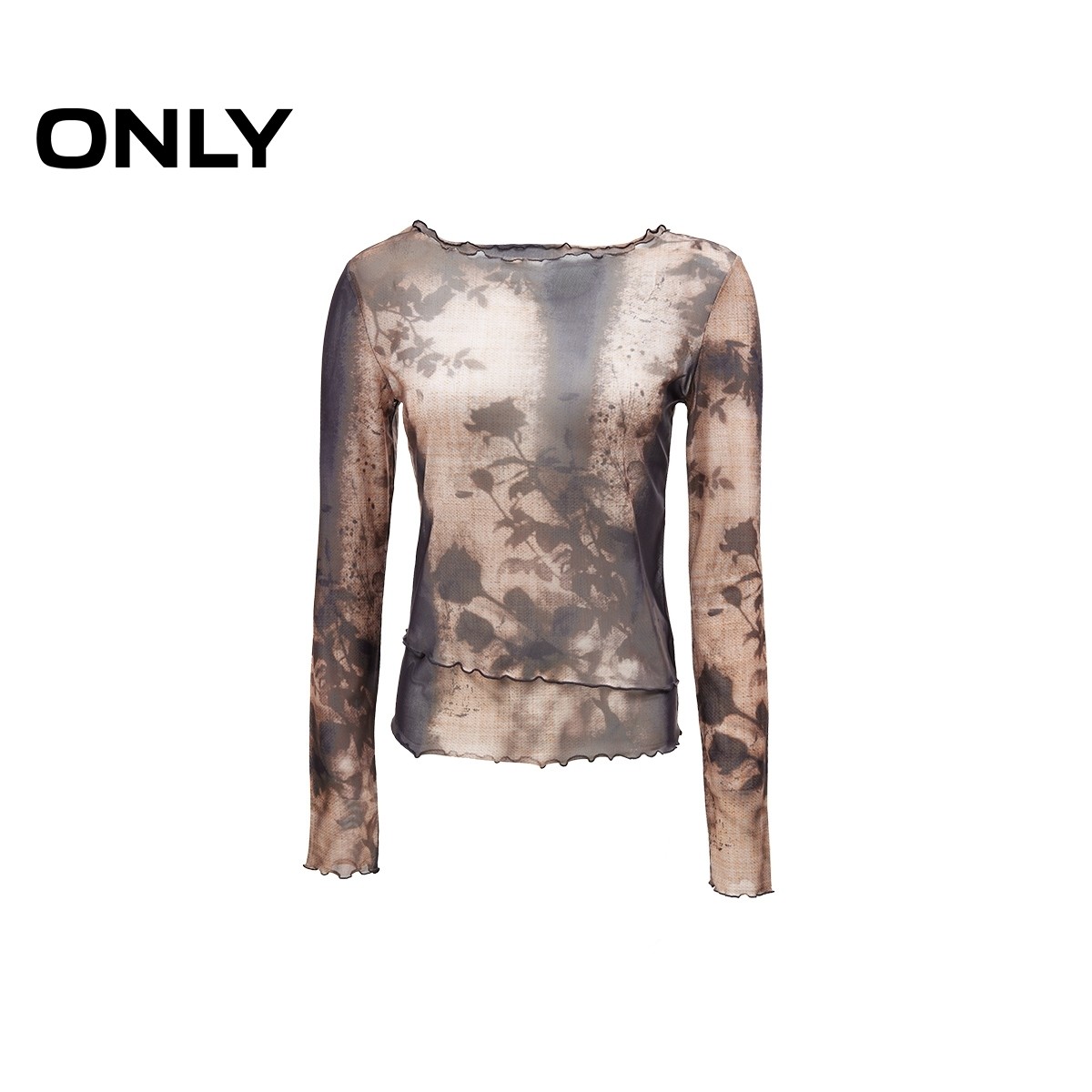 ONLY秋季木耳边印花修身显瘦轻薄长袖T恤女|124302007