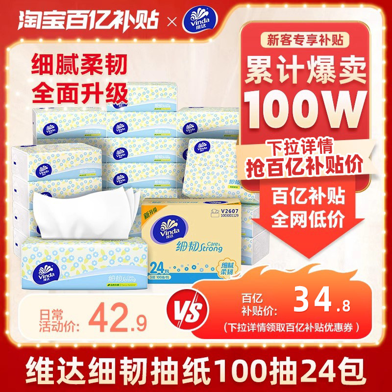 【百亿补贴臻选】维达抽纸棉韧立体美24包整箱家用实惠装卫生纸巾
