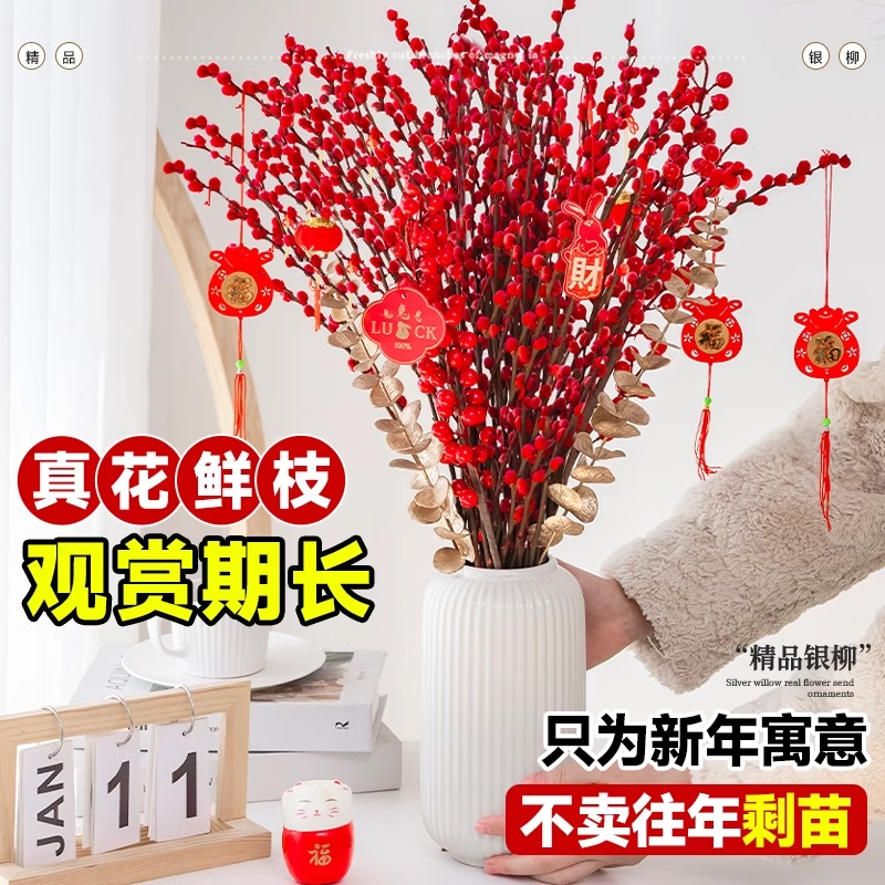 银柳真花鲜枝客厅摆件雪柳红色喜庆干花枝室内装饰年宵花水培植物