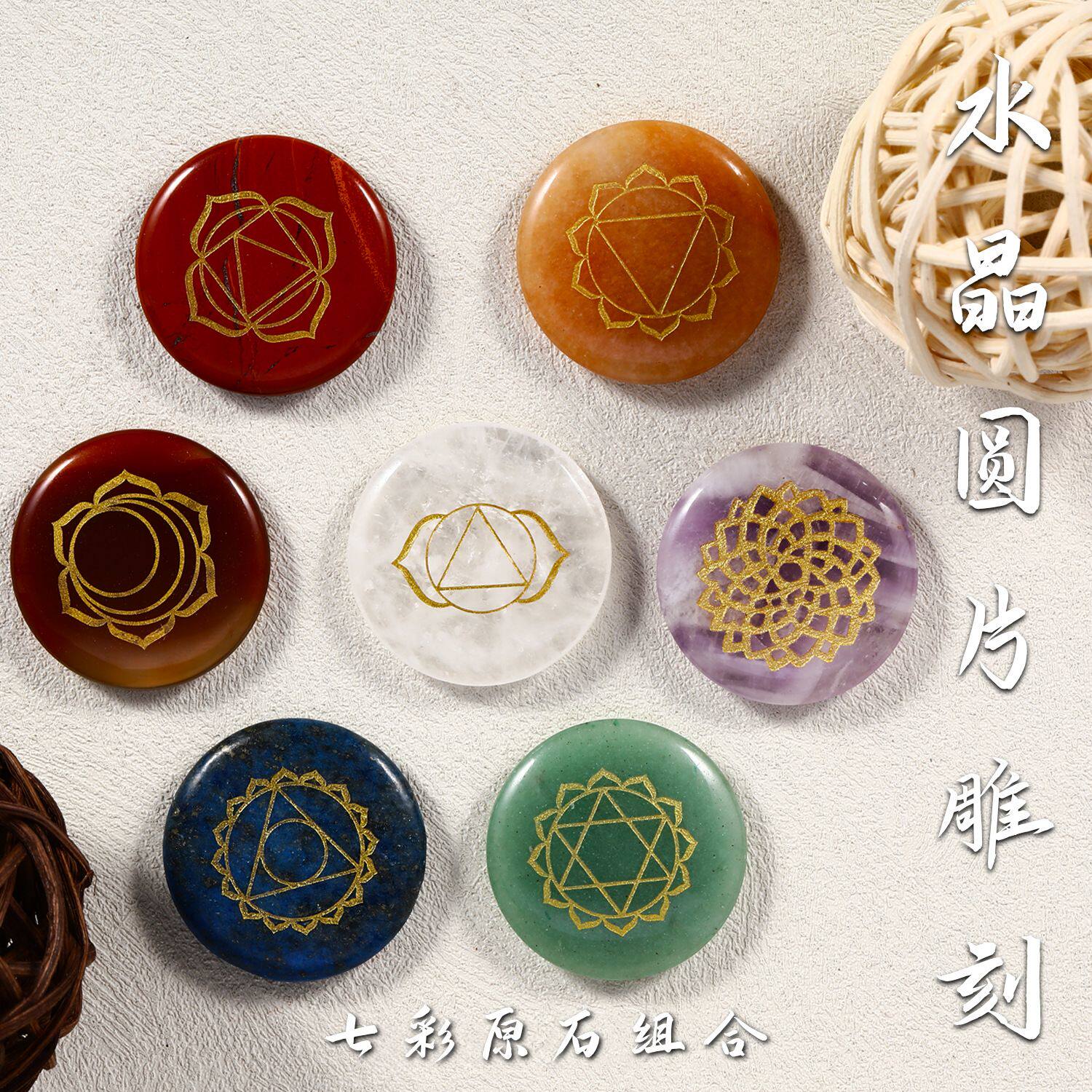 源头工厂天然七色水晶石查克拉圆片套装雕刻元素字符摆件饰品配件