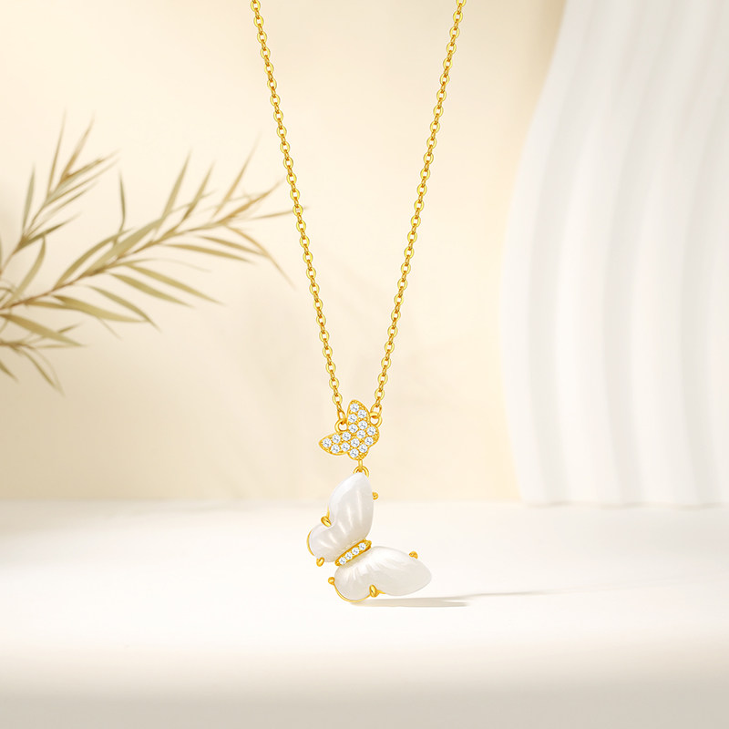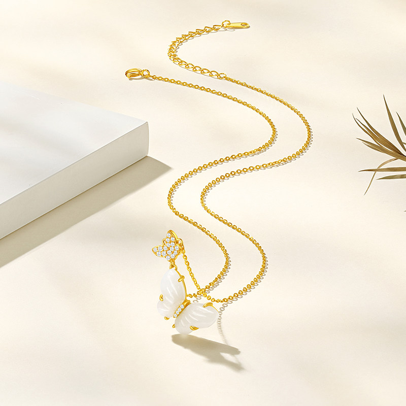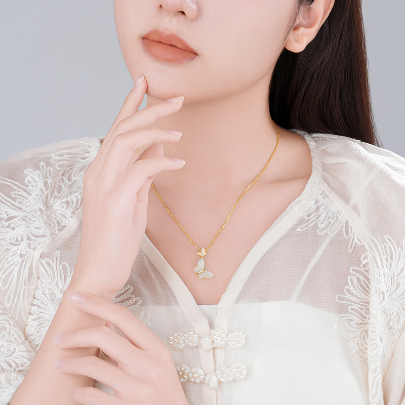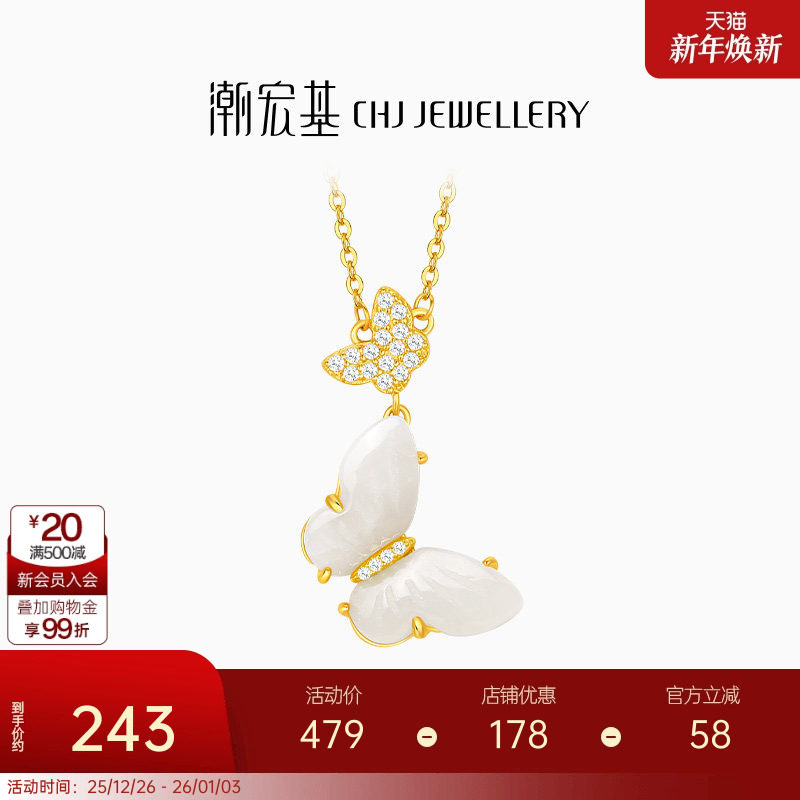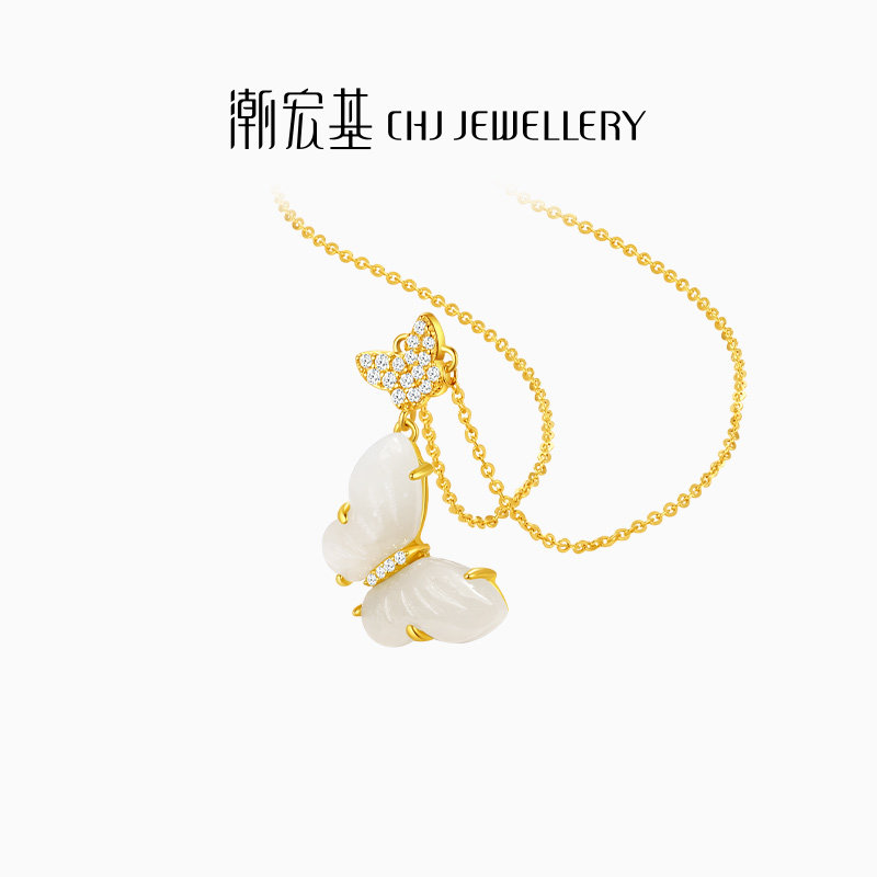 潮宏基花韵s925银和田玉项链银饰套链蝴蝶颈饰时尚送女友礼物