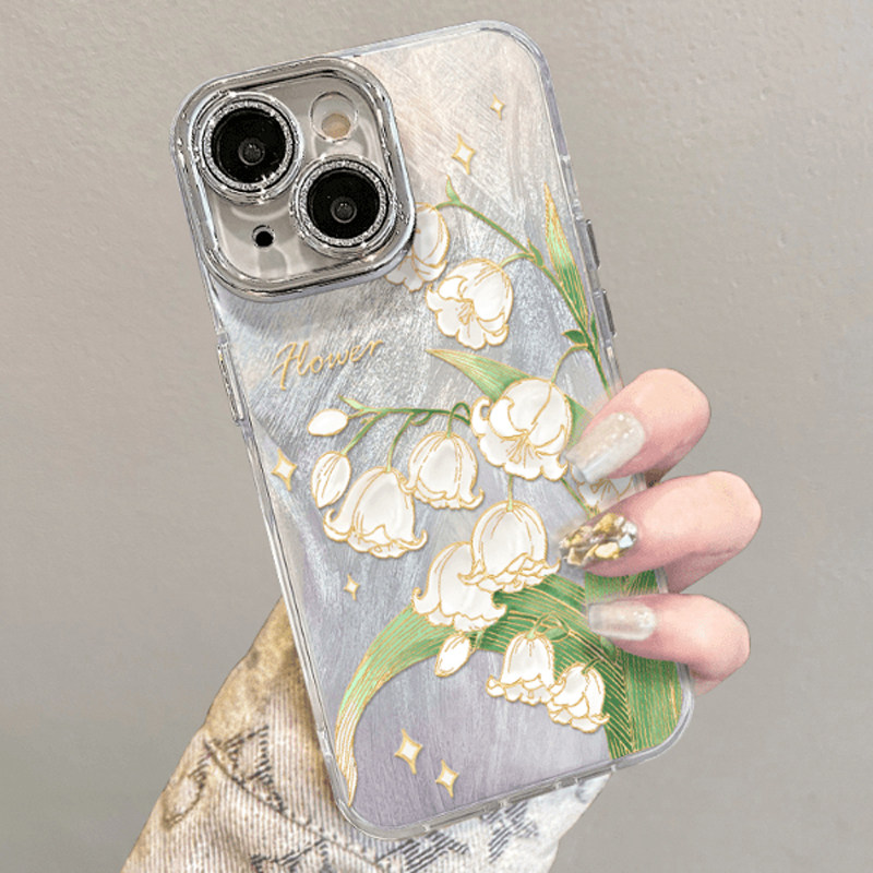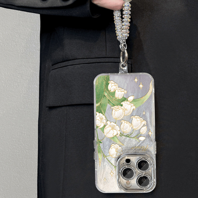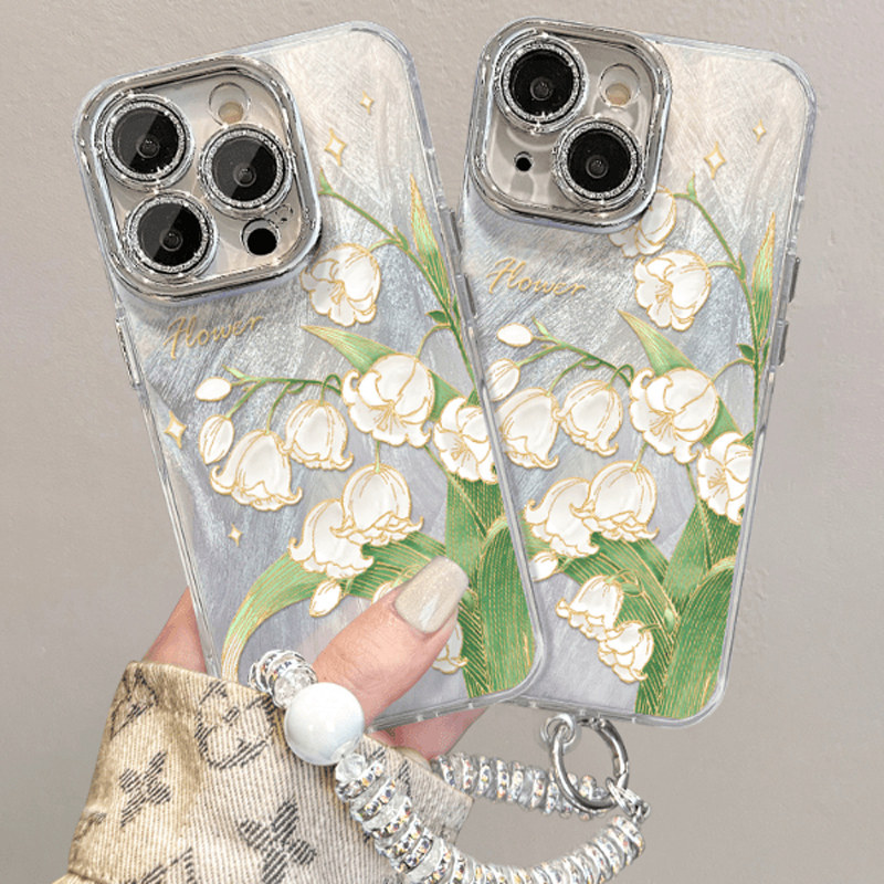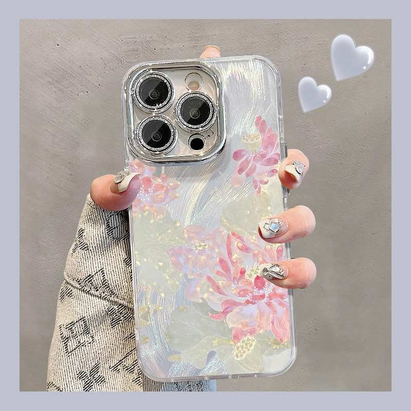 适用苹果16promax手机壳新款银色羽纱风铃花粉荷花iphone15pro高级感镜头全包带手链15plus小清新小众14创意