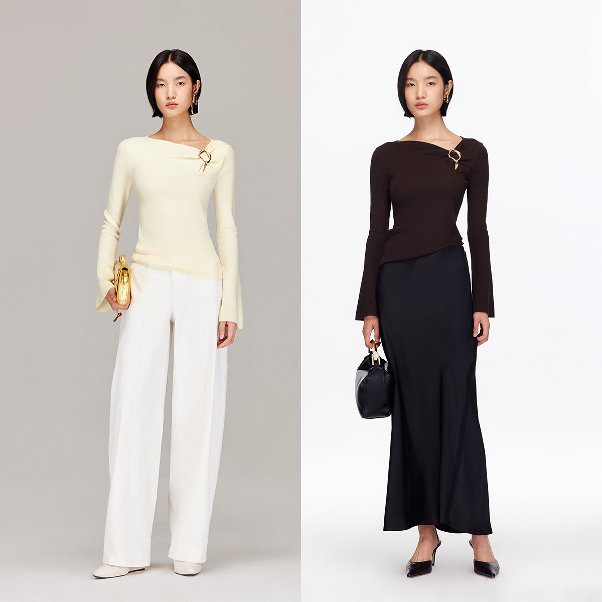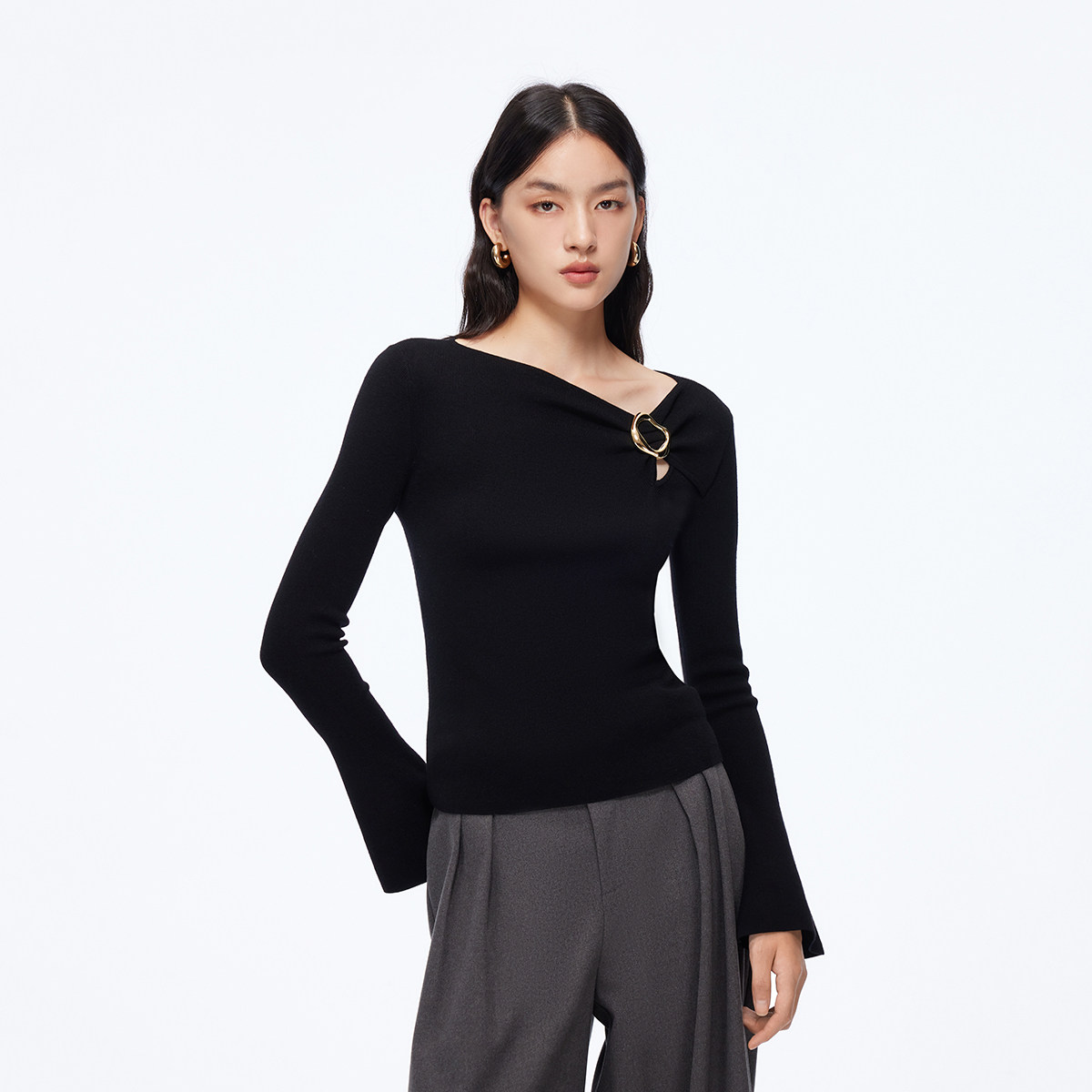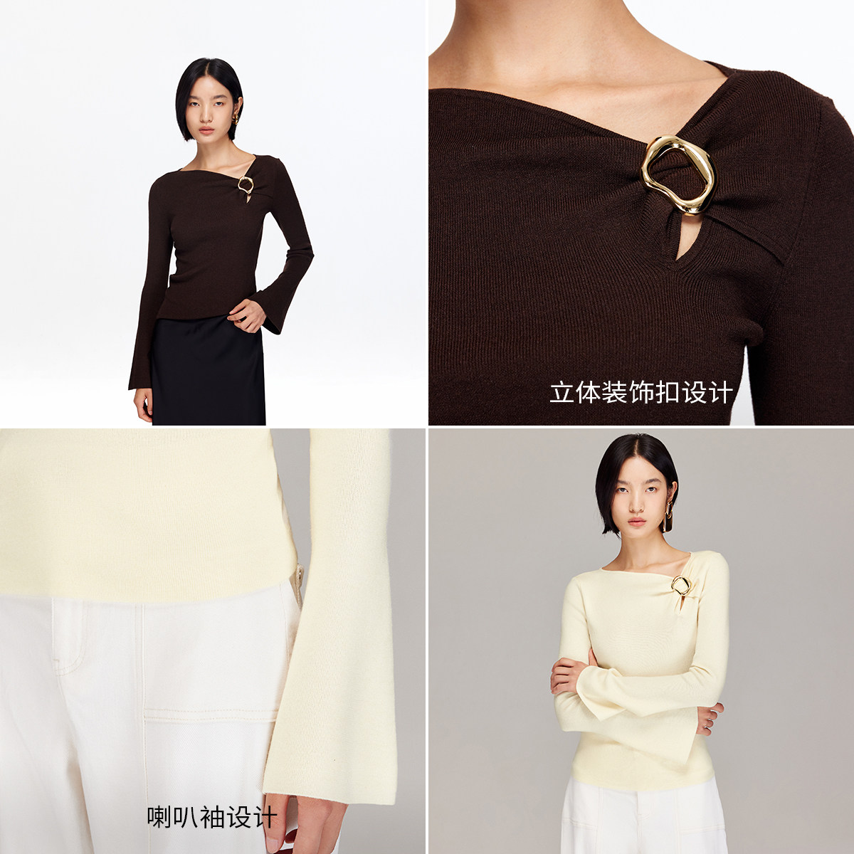 Vero Moda针织衫女25秋季新含羊毛喇叭袖修身白色斜领上衣千金风