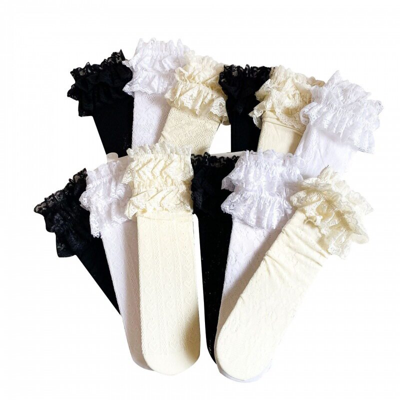 女童袜子花边夏季洛丽塔配裙子蕾丝长筒公主袜宝宝小腿袜黑色纯棉