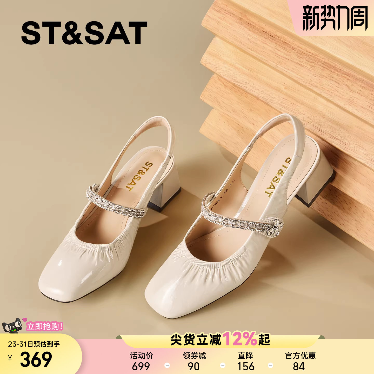 星期六优雅风真皮方头闪钻包头凉鞋女2026夏季新款粗跟后空通勤鞋