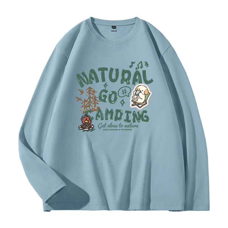唐狮圆领长袖t恤男春季宽松打底衫情侣款小狗印花100%纯棉上衣HW