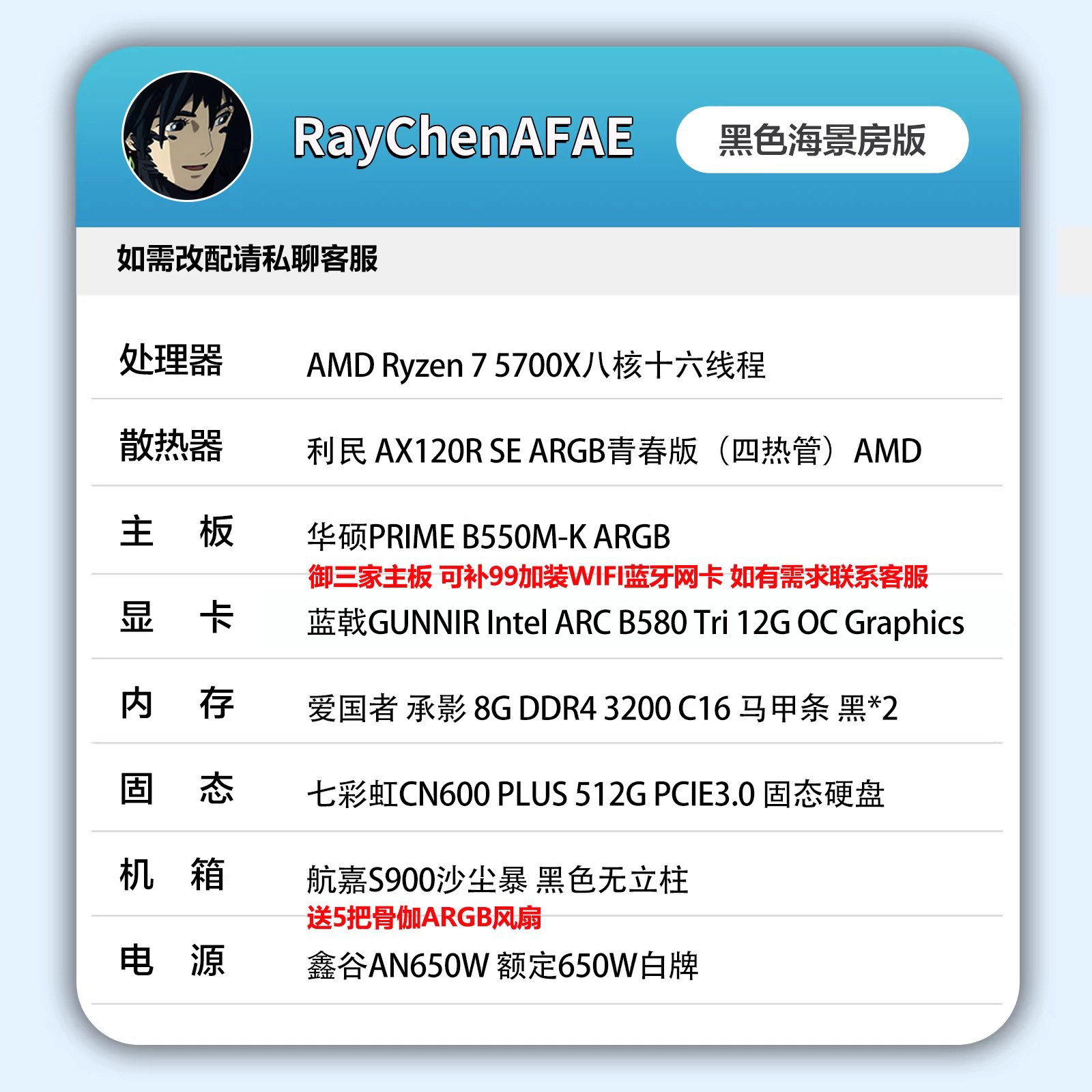 R7 5700X+IntelB580高颜值RGB海景房高性能DIY游戏生产力电脑主机
