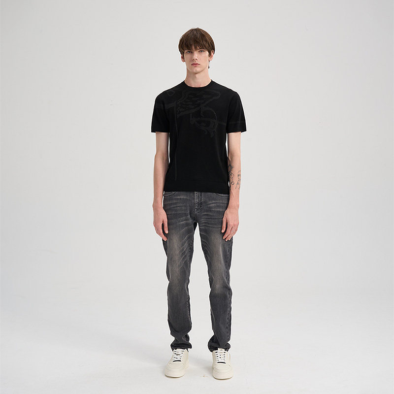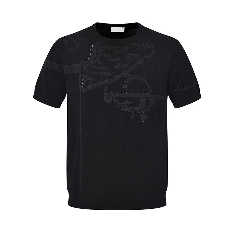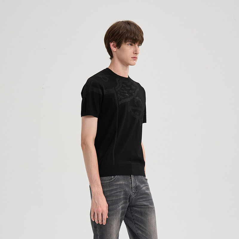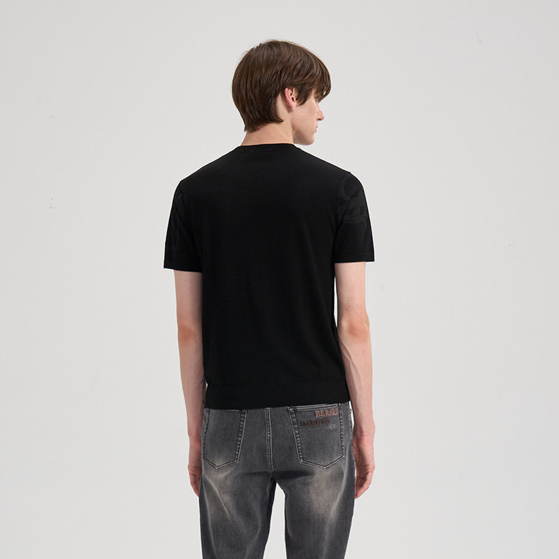 RARE威雅男装 2025秋冬新款绵羊毛针织衫男士T恤黑色圆领短袖毛衫