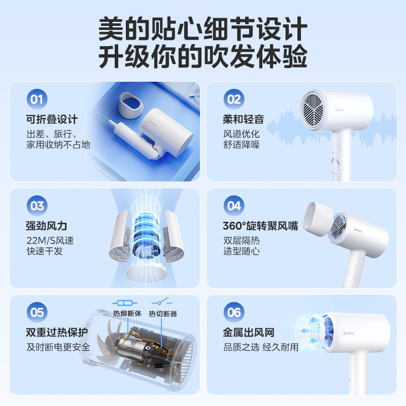 美的吹风机折叠家用负离子电吹风护发大风力风筒机宿舍用学生便携
