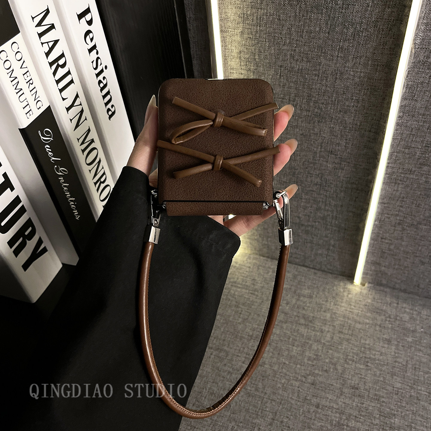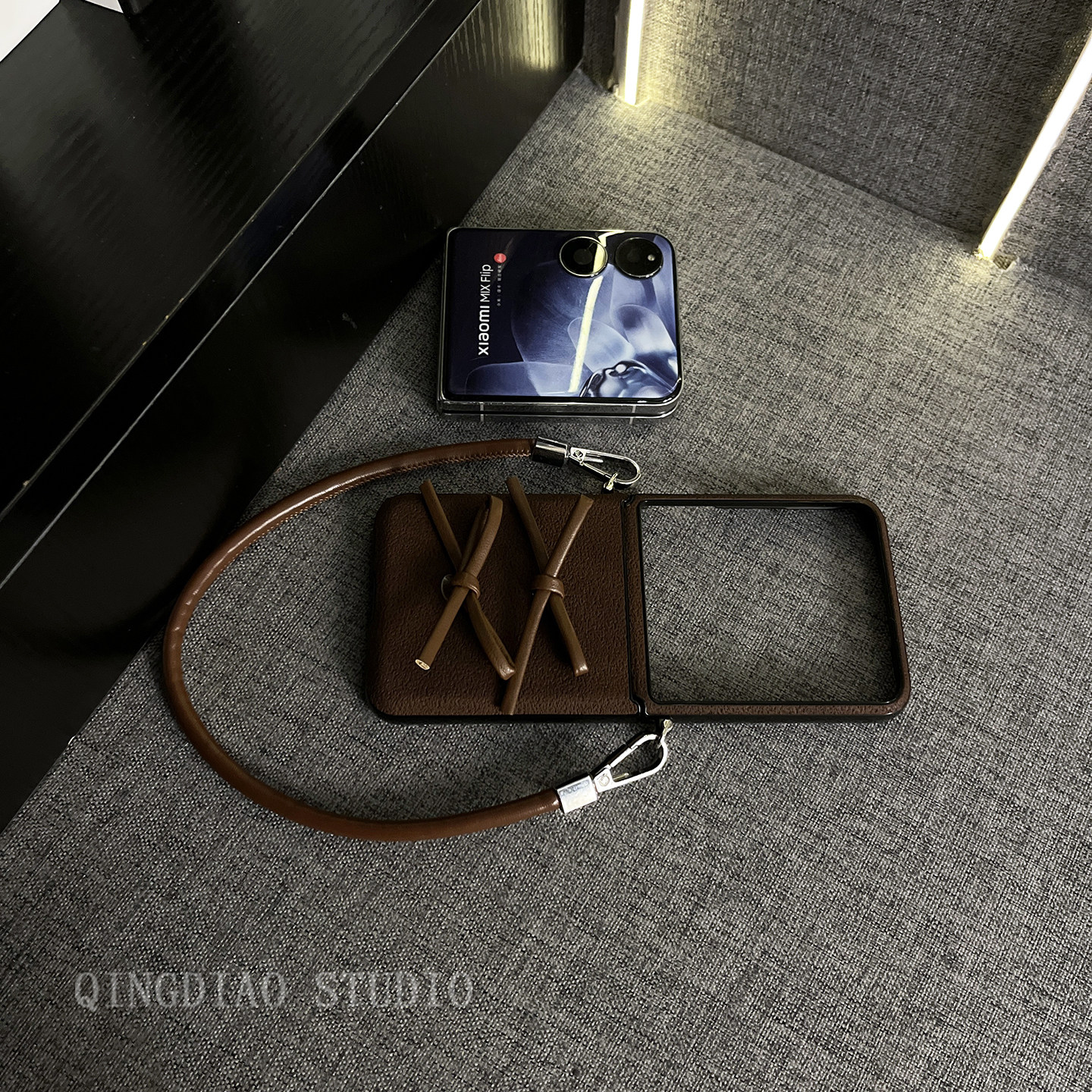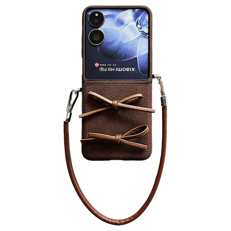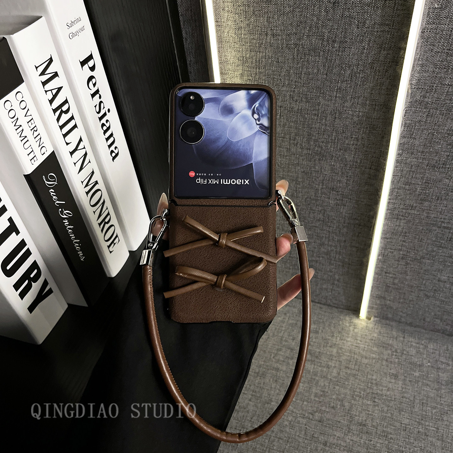 轻调 ins日韩棕月坑纹蝴蝶结皮质手绳适用于小米MIX Flip2手机壳全包新款MIX限量版flip折叠屏翻盖防摔保护套