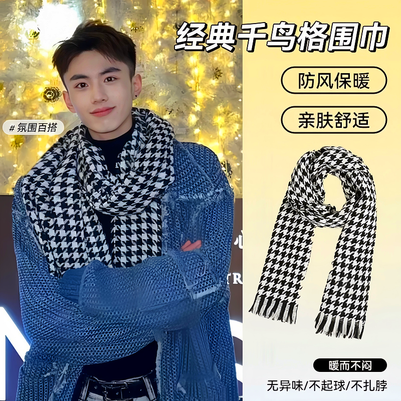 千鸟格子围巾女冬季保暖帽子韩版百搭高级感流苏撞色针织围脖披肩