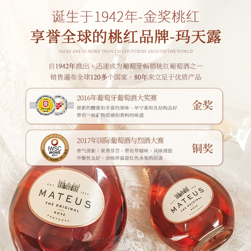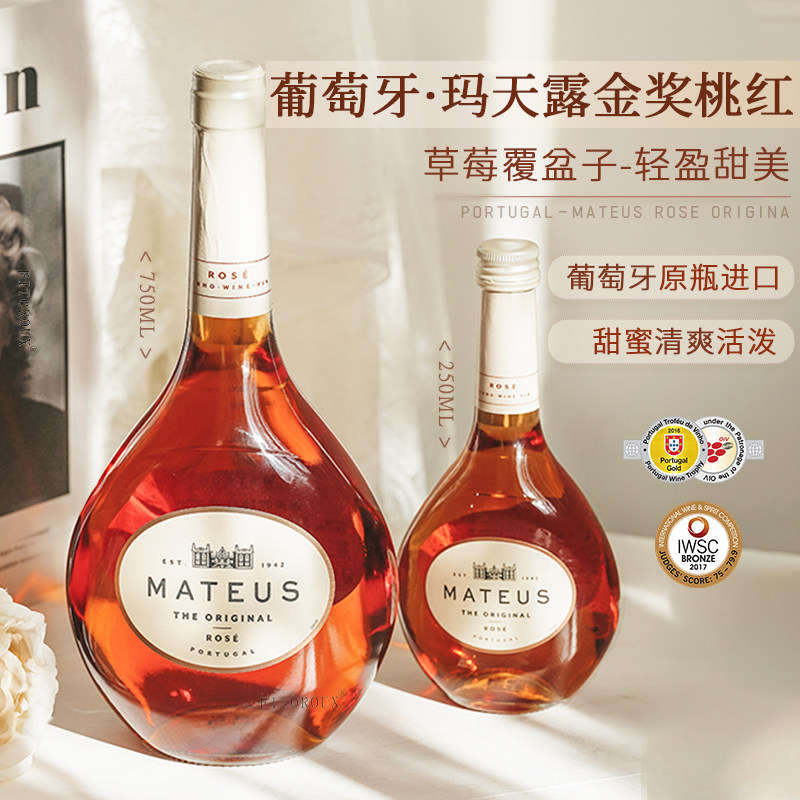 【金奖】mateus rose葡萄牙进口玛天露桃红葡萄酒半甜小瓶果酒