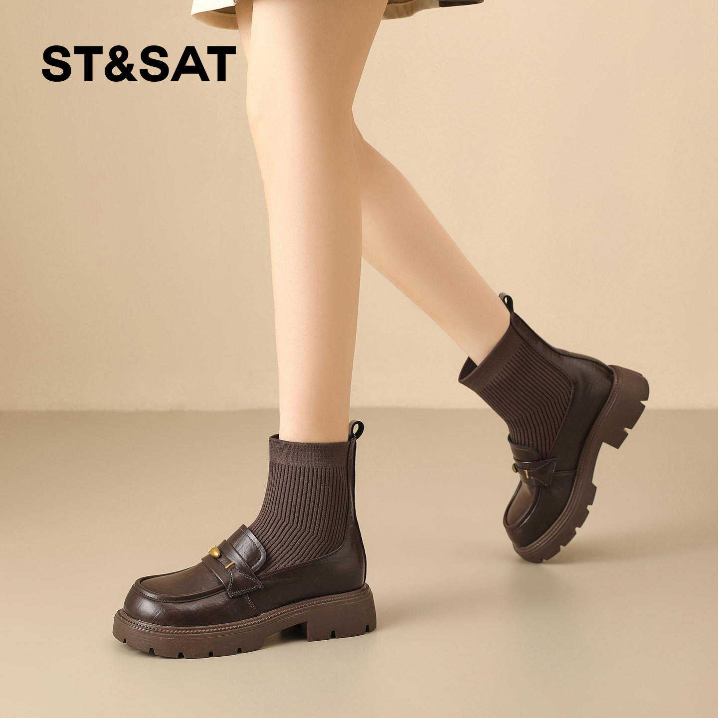 星期六马丁靴女2025冬季新款女靴女款加绒真皮靴子袜靴短靴弹力靴