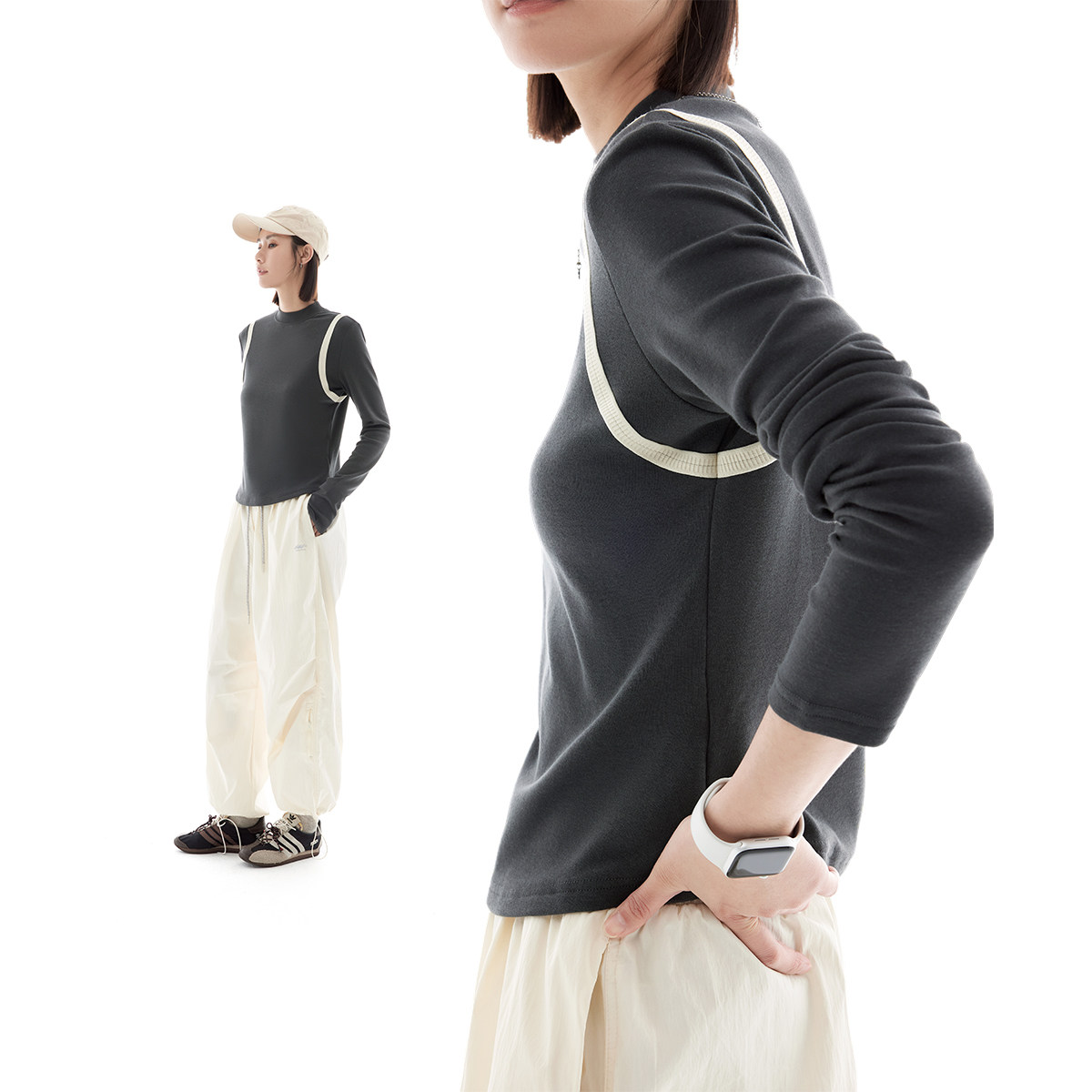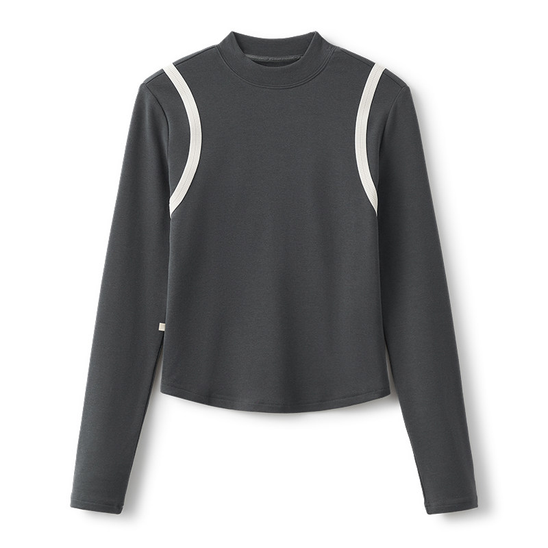 云上生活【织带T】零压感拼接撞色短款灰色长袖女T恤春秋新款上衣
