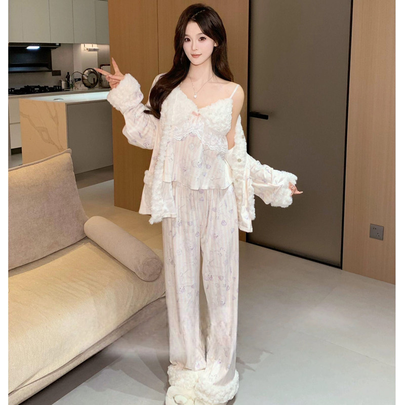 2025新款海岛绒睡衣少女秋冬季带胸垫吊带性感纯欲风三件套家居服