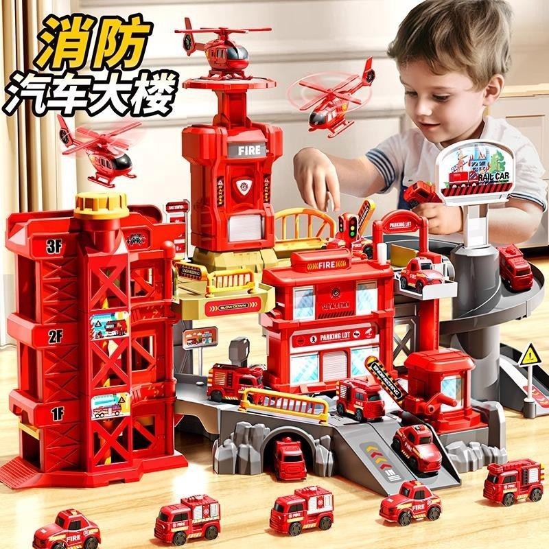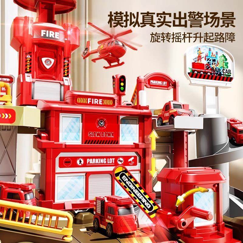 消防小火车电动轨道车滑行停车场男孩汽车闯关大冒险儿童兼容乐高