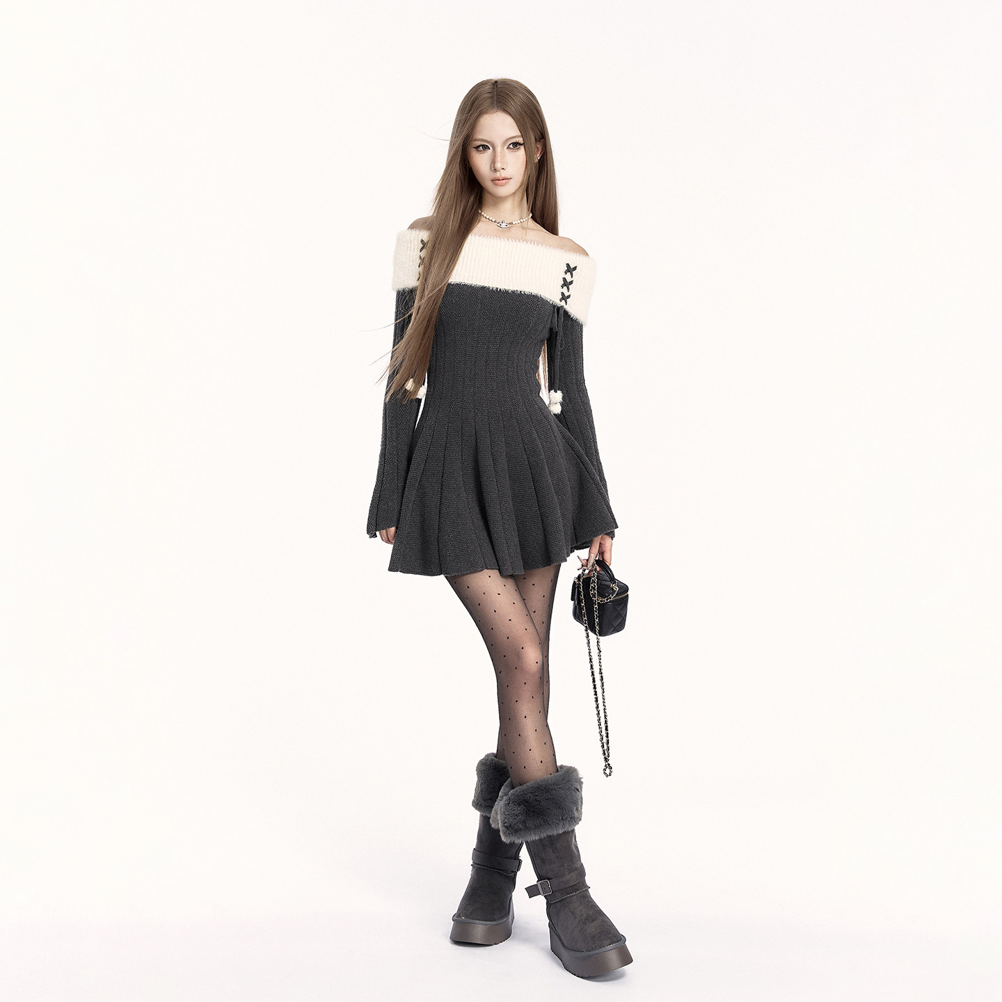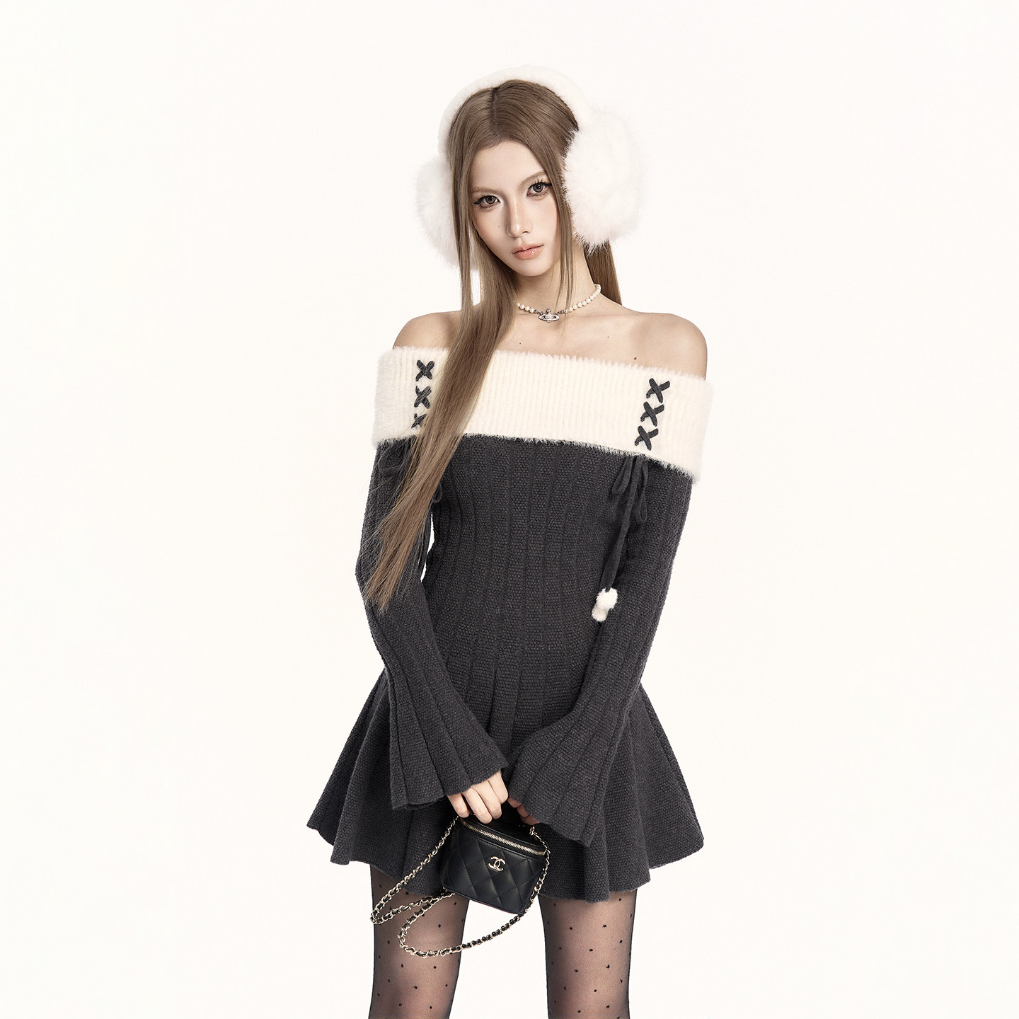 VOCK 冬季恋歌 纯欲氛围感新年针织长袖毛衣一字肩收腰显瘦连衣裙
