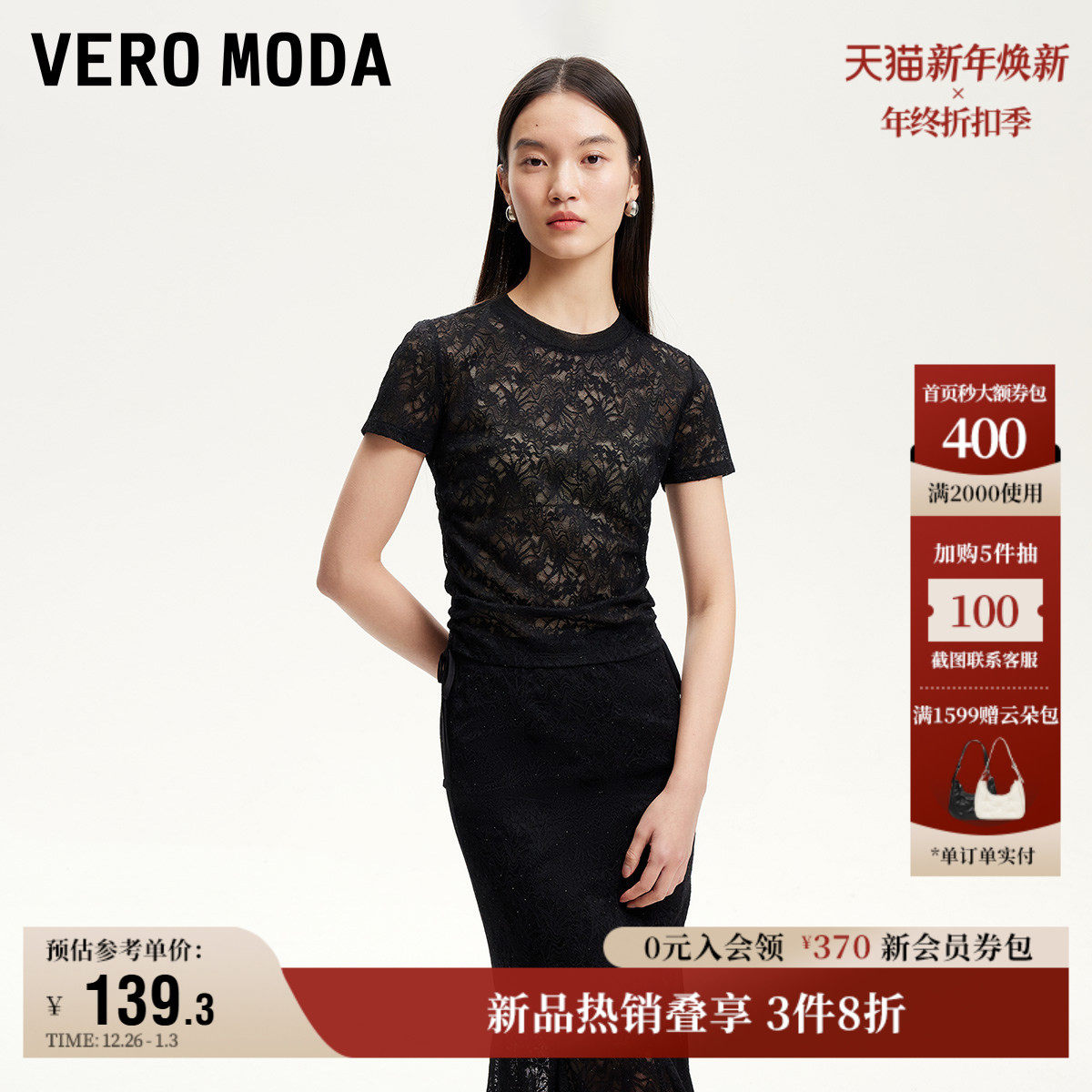Vero Moda奥莱T恤女2025秋季新款半透蕾丝水钻抽褶系带时髦短袖