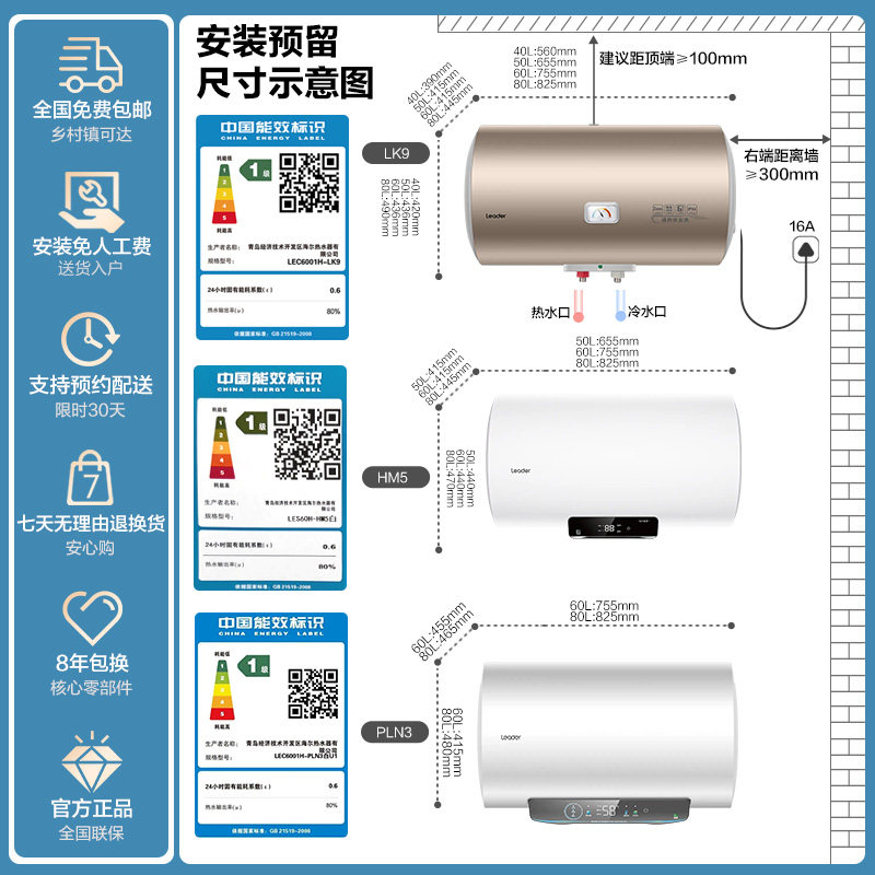 [政府换新补贴]海尔智家统帅电热水器家用洗澡60/80L一级节能速热