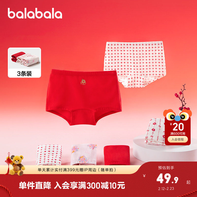 巴拉巴拉女童内裤平角棉本命年红色2025新款儿童短裤四角三条装潮