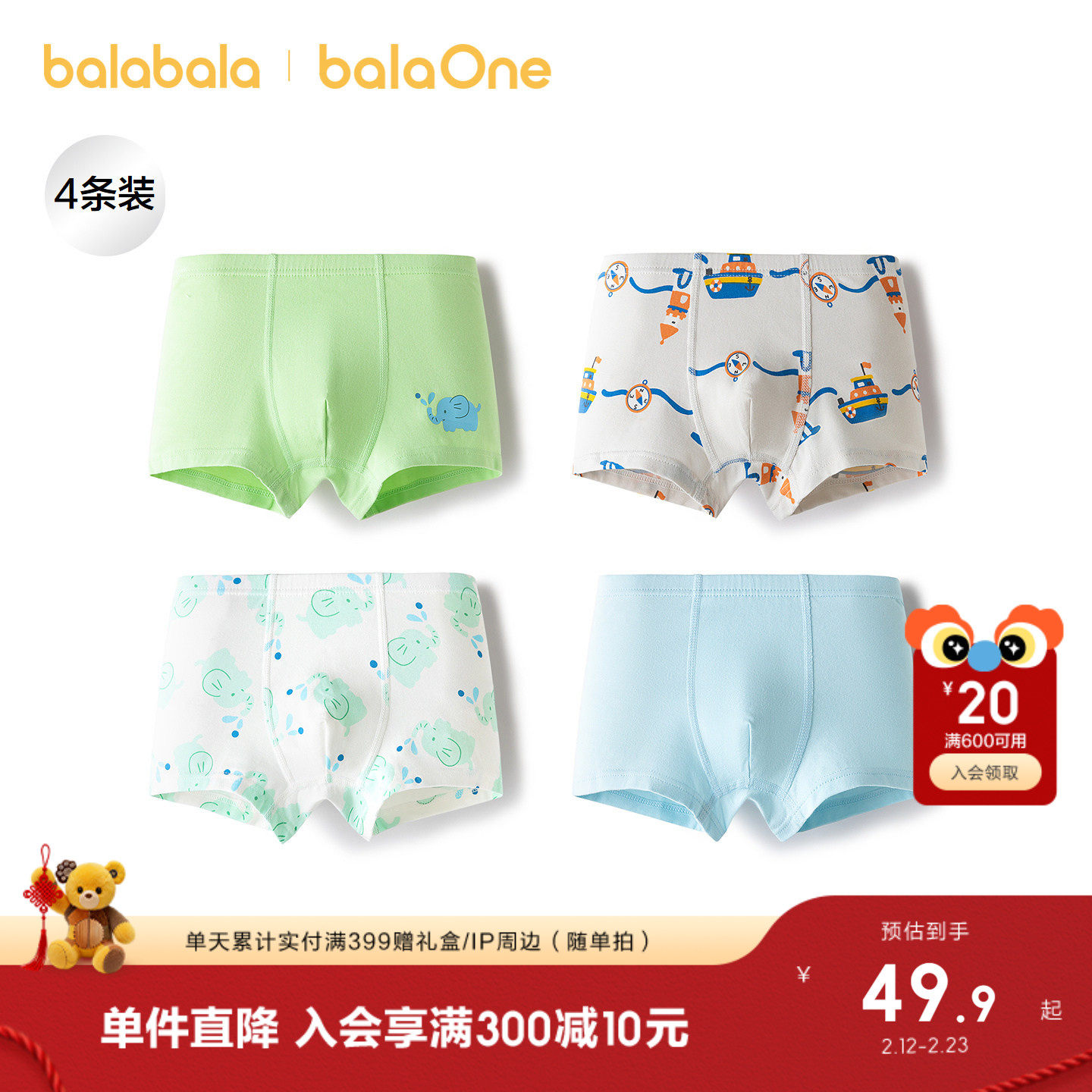 巴拉巴拉男童内裤棉平角儿童四角短裤小童宝宝不夹PP抗菌潮四条装