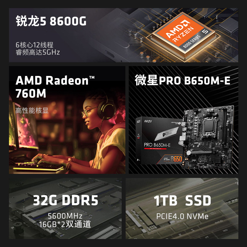 百补+国补】AMD锐龙5 8600G核显办公家用商务炒股游戏台式组装机集显AI主机设计直播DIY整机网游电脑带显示器